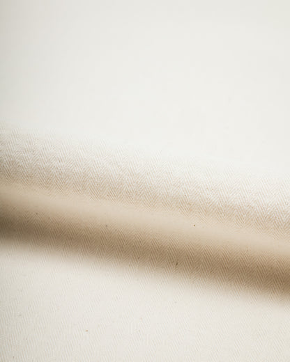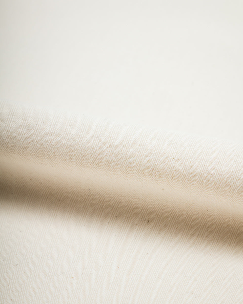 This batch is made from a medium-weight 100% cotton herringbone twill fabric. It's a natural ecru, undyed, with small neps visible throughout. HBT makes for an excellent summer fabric, as it breathes well and dries more quickly than some other weaves, with a comfortable and relaxed drape throughout.