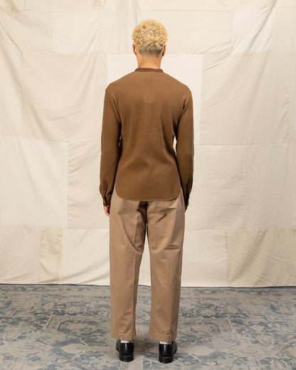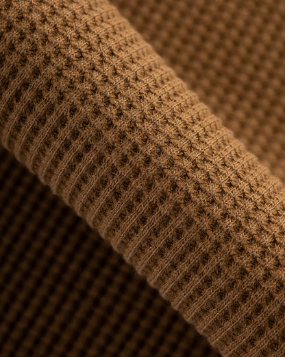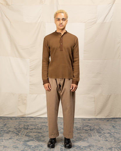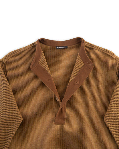 The Hermann Long Sleeve Henley is made from a waffle-knit jersey and inspired by vintage long underwear tops. There is cotton twill detailing along the neck, button front, and cuffs. The three button front is completed with matching fabric covered buttons.