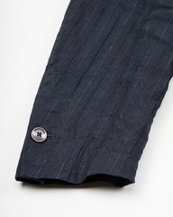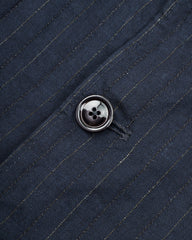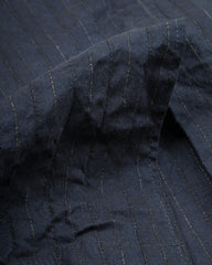 It's made from a custom lightweight cotton/linen fabric that was developed by 1st PAT-RN for their exclusive use, and is produced for them in Veneto, Italy. It's woven in a vertical pinstripe slub pattern, and is finished with a double-washing process (the fabric is washed once before cutting, and the garment is washed a second time after sewing) to relax and soften everything, imbuing it with a slightly more worn and weathered texture.