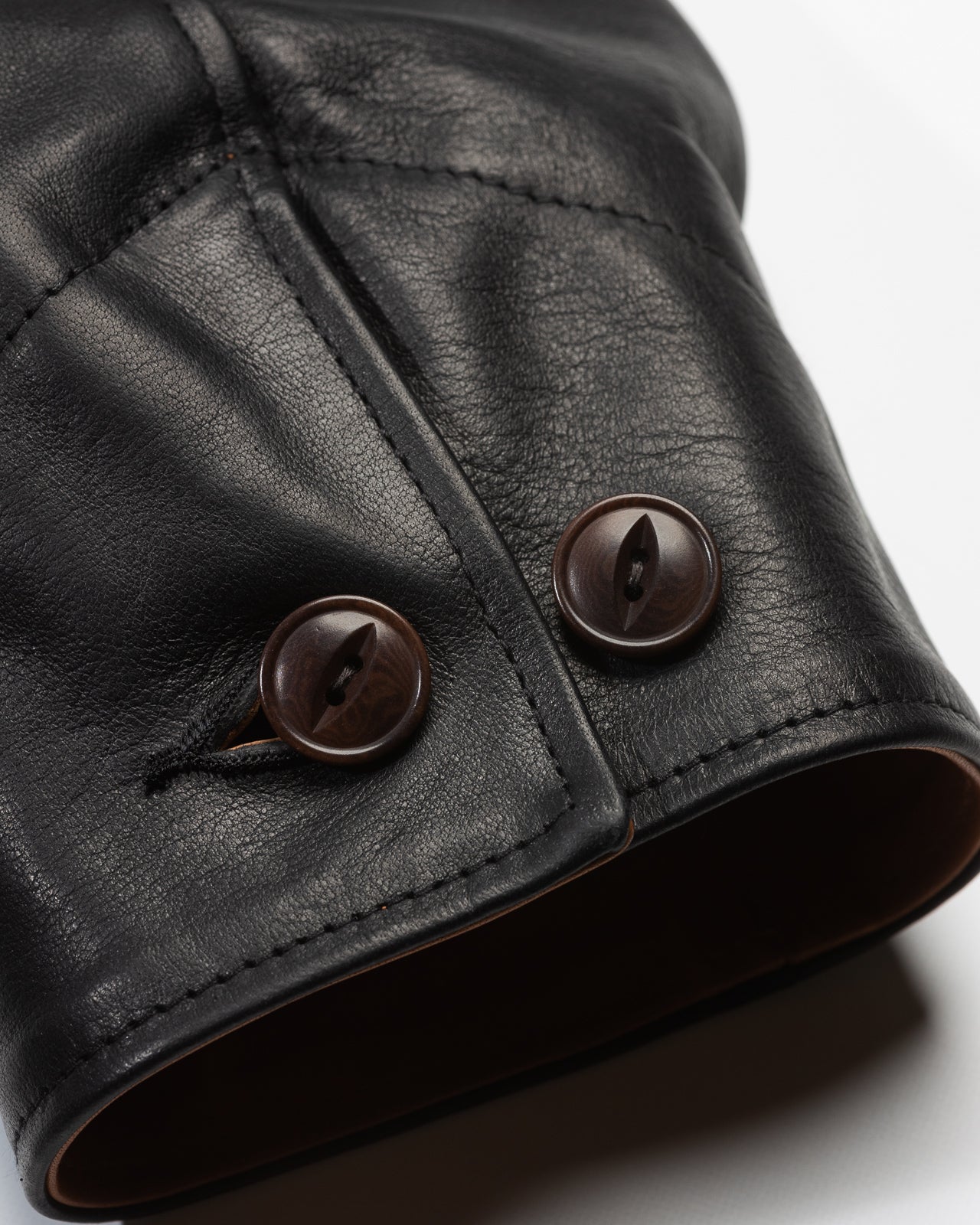 Featuring a rounded "cossack" style collar, it's additionally secure thanks to the neck button that secures the top of the jacket closed, right below the collar. The front closes up with a stainless steel zip, and the sleeves button closed with tonal catseye buttons.