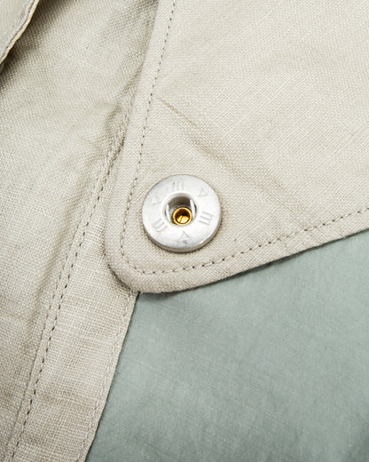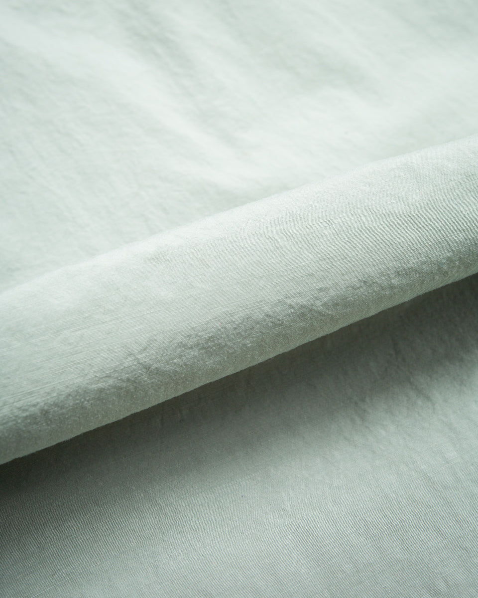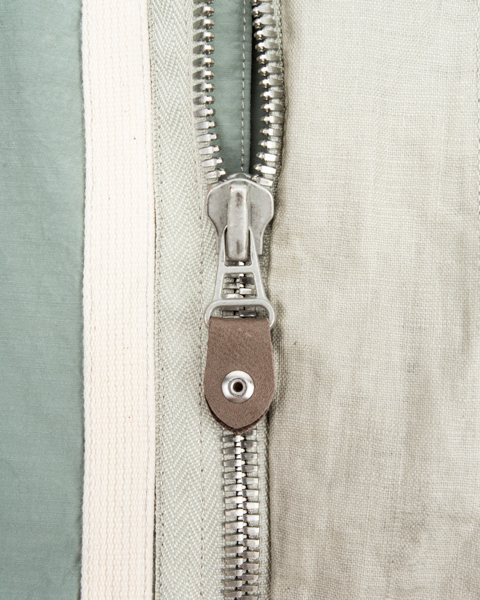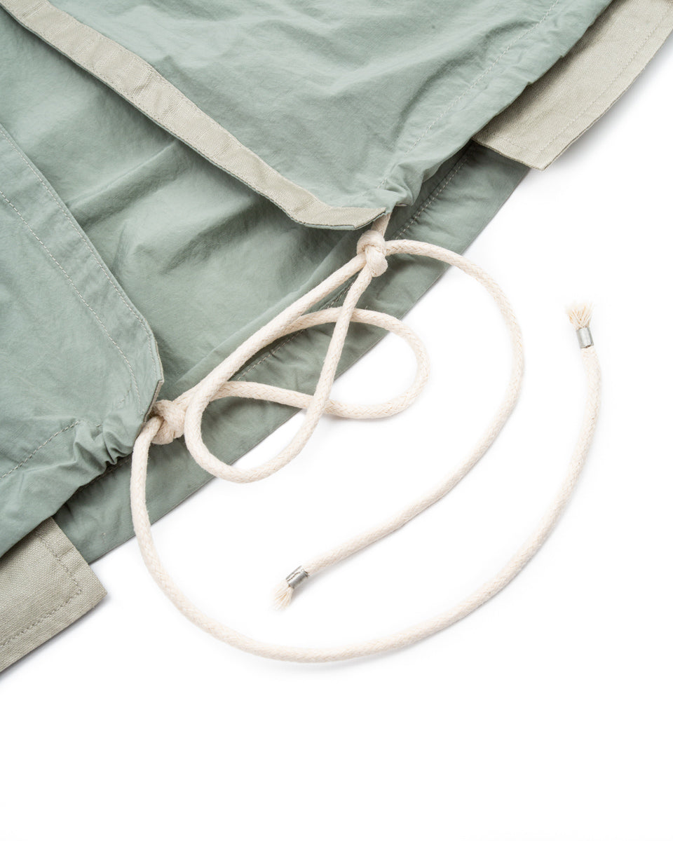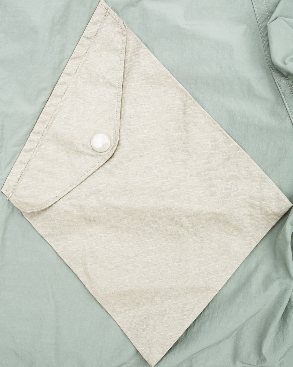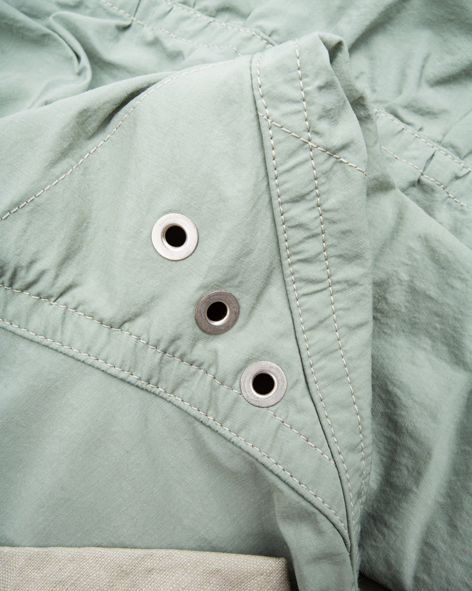It's made from a lightweight Japanese shrunken nylon, which is salt-shrunk after weaving to increase its density. This process also imbues the fabric with a slightly irregular texture, and a subtle luster throughout, as well as making it more resistant to wind and water. It's trimmed with a coated linen fabric for a subtle tonal contrast and additional durability where it matters most, protecting the seams, pockets, and various flaps.