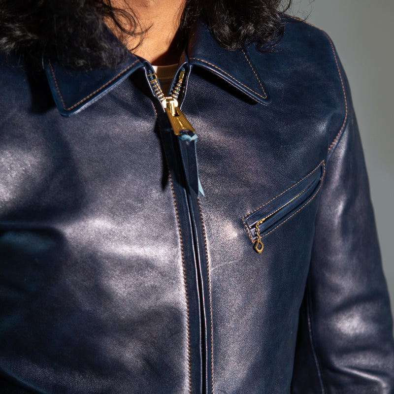 Dying leather with indigo is actually quite a difficult process, it's something that's easy to get not quite right, and even easier to mess up completely. The tannery that have managed to dye the horsehide used on these jackets such a consistent and rich indigo came upon this recipe after years of trial and error. As the process to dye horsehide is very different from the process of dying cotton, you can expect this indigo leather to act a bit differently over time than your favorite pair of jeans.