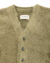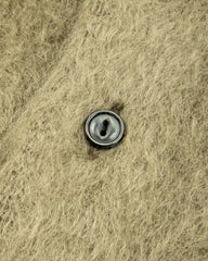 Most Mohair cardigans (and Mohair garments in general) you'll find are made with yarns that feature a blend of mohair and synthetic threads. For their cardigan, the Real McCoy's have developed a mohair yarn that is 80% mohair and 20% wool, with a solid wool core that the mohair is spun around for maximum softness and durability.