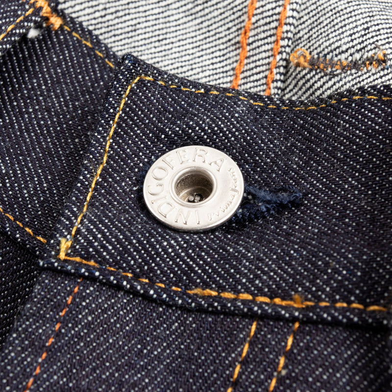 The trims are equally superior, with custom Indigofera donut buttons and copper riveting at high stress points, and a Griffon-stamped leather flasher on the back guarantees this as a genuine Indigofera product.