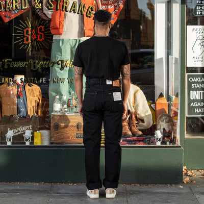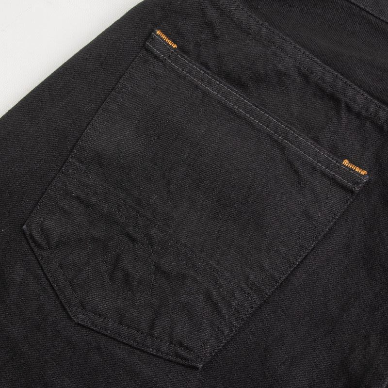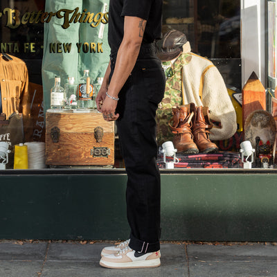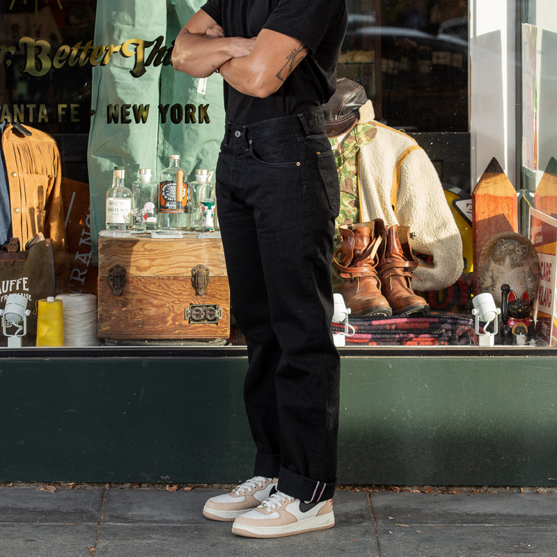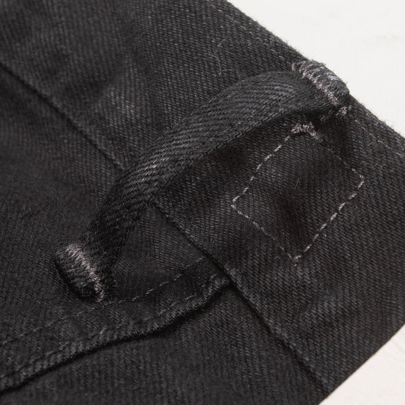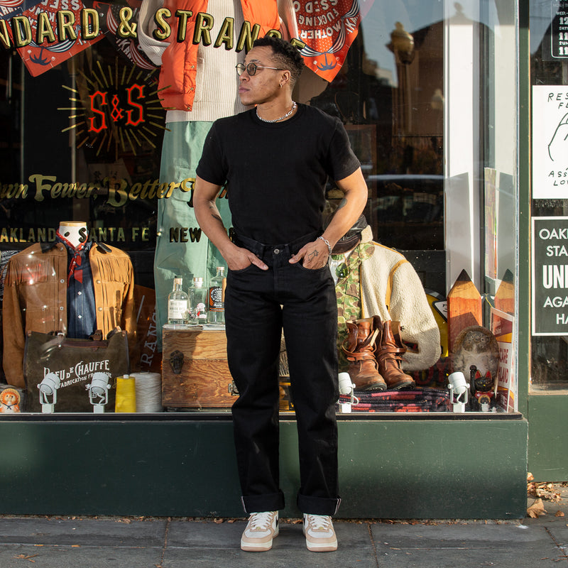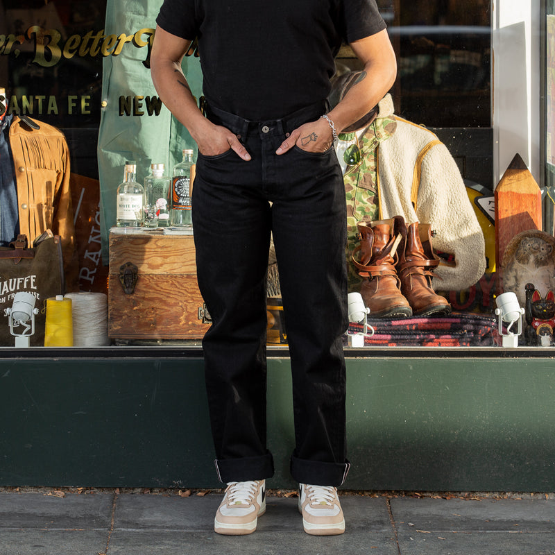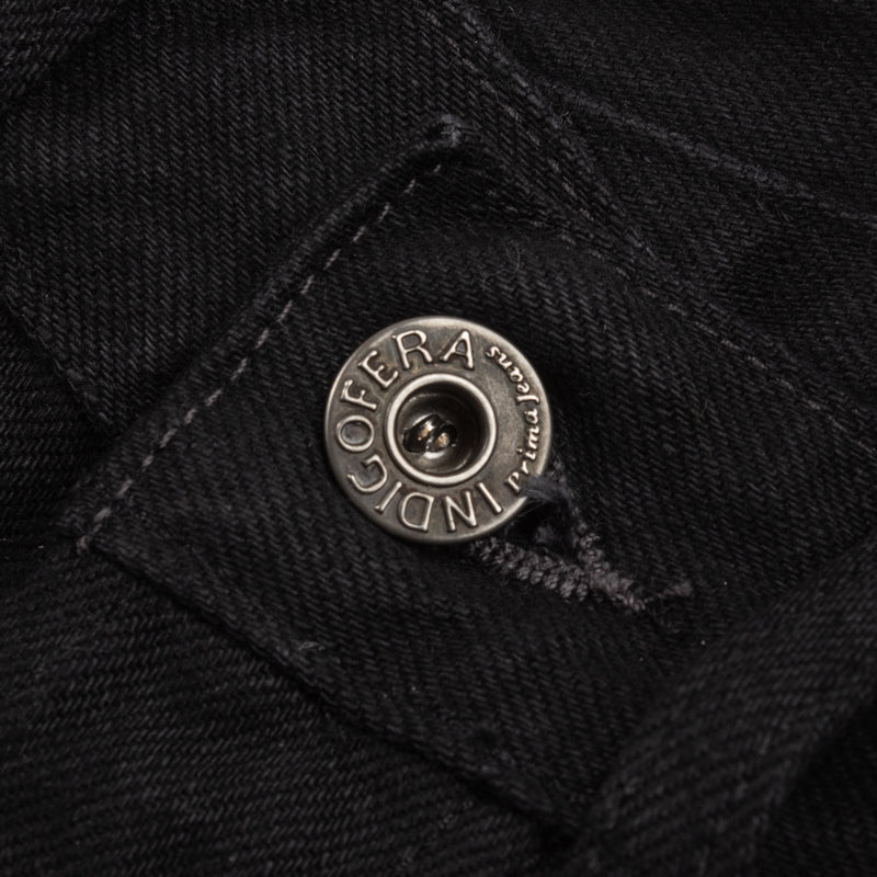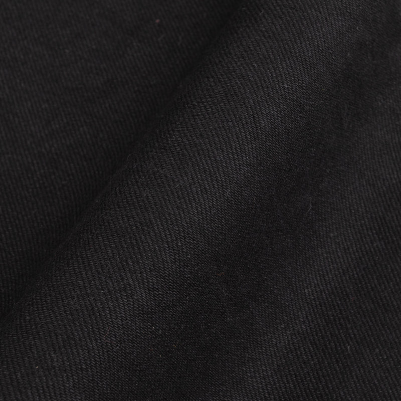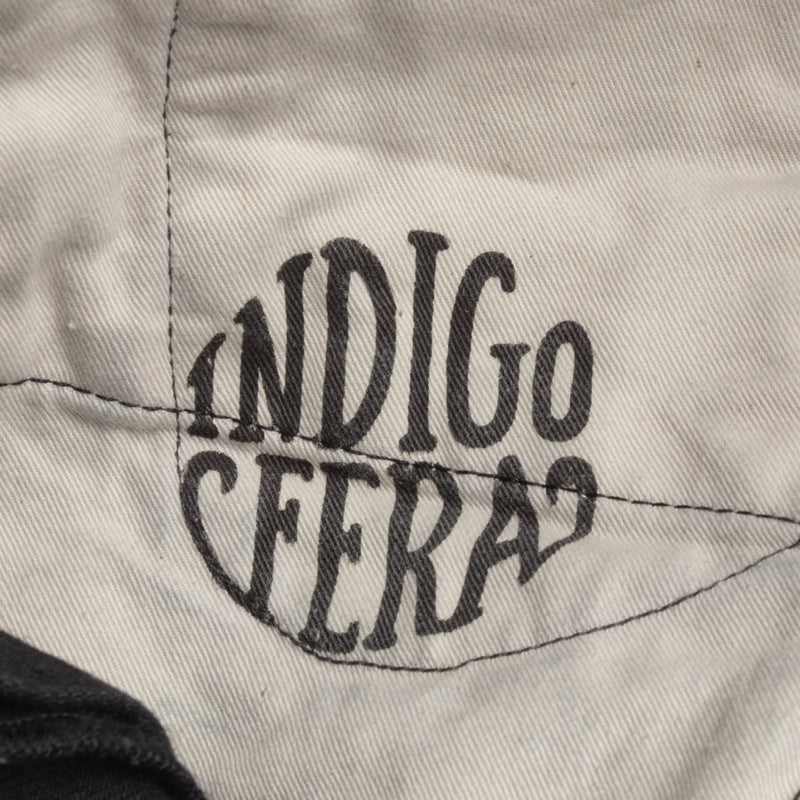 Gunpowder is not just a cool name that Indigofera settled on for their black denim – it’s actually descriptive, as the dye used for the black warp/black weft fabric contains actual gunpowder, helping to give the color both a deep blackness and a little sheen. Custom developed with and produced exclusively for Indigofera by Nihon Menpu Mills in Japan, this all-black denim will fade to gray over time, in the same way that indigo denim does but in grayscale, growing much softer with wear and washing.