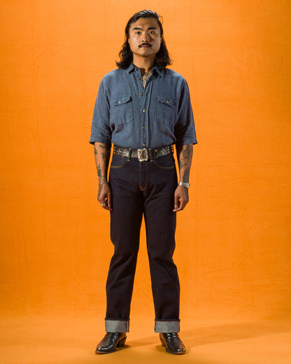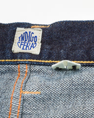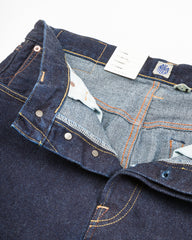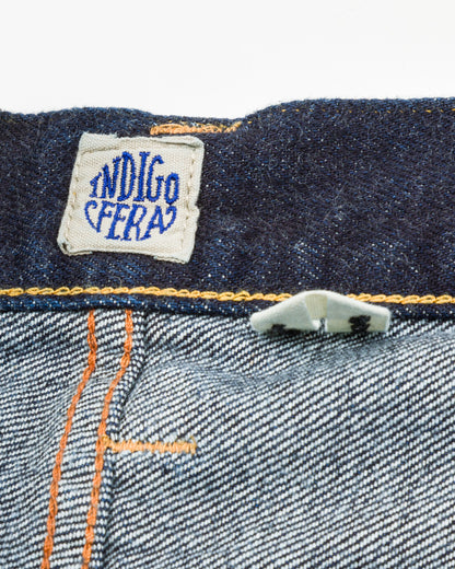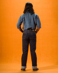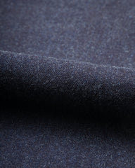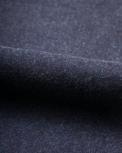 The No. 9 denim by Indigofera is made exclusively for them by Nihon Menpu. The idea behind this denim is to have a denim that is so tightly woven that no white will show through from the weft. This tight weave combined with a dark rope dye on the warp yarns create a very dark denim that will fade slowly. It's been finished with a single rinse to soften things up a bit and handle the initial indigo loss of the first wash.