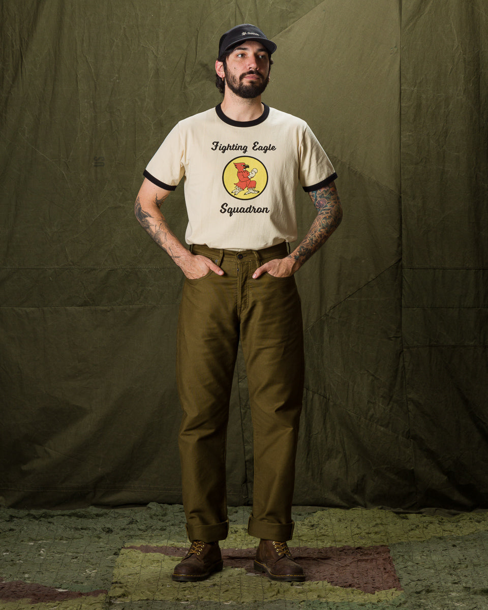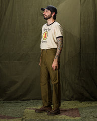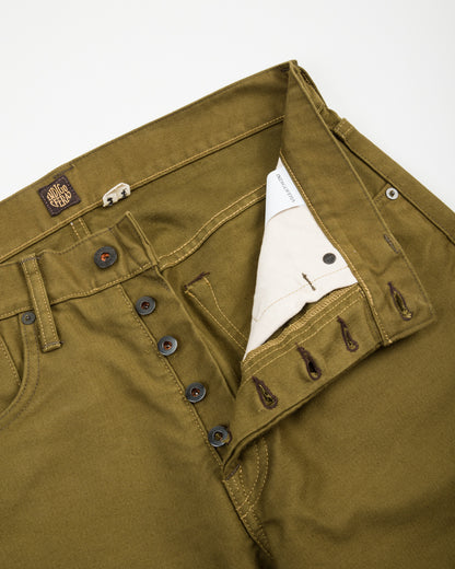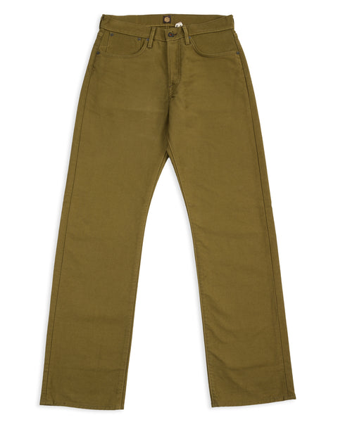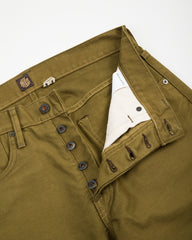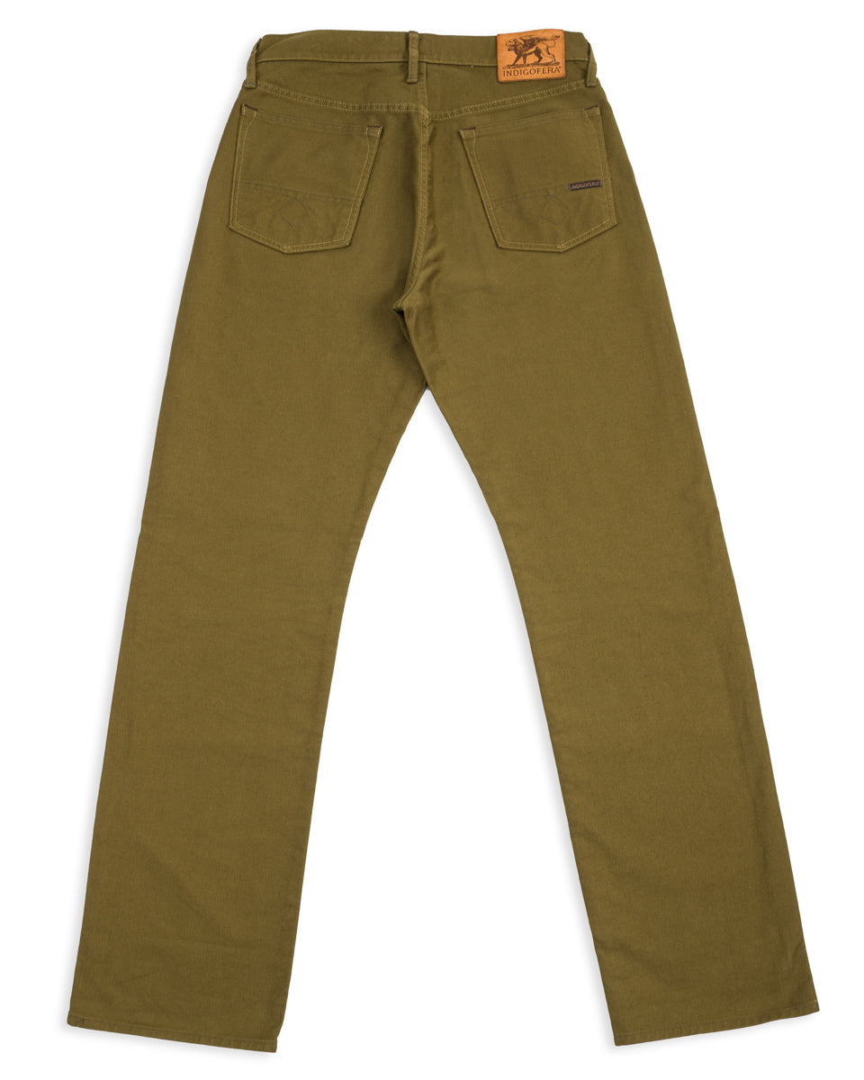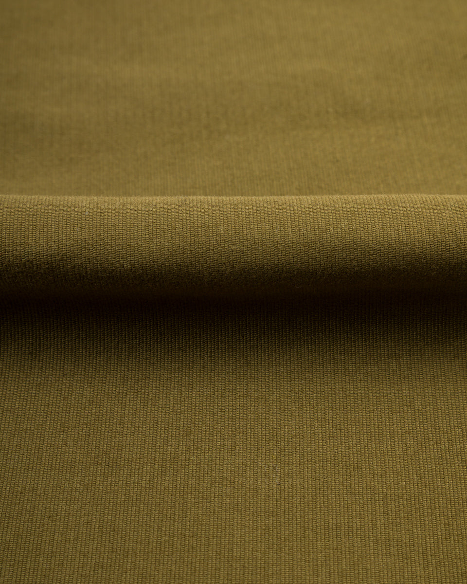 This edition comes to us sewn up in a solid 13.5oz dark olive bedford cloth. This micro-cord fabric is the same type of cloth that is used in N-1 deck jackets, and is famous for its sturdiness and wind-resistance. Indigofera have given these a rinse to account for initial stiffness (and shrinkage), helping to break them in a bit for you, so they're more comfortable out the gate.
