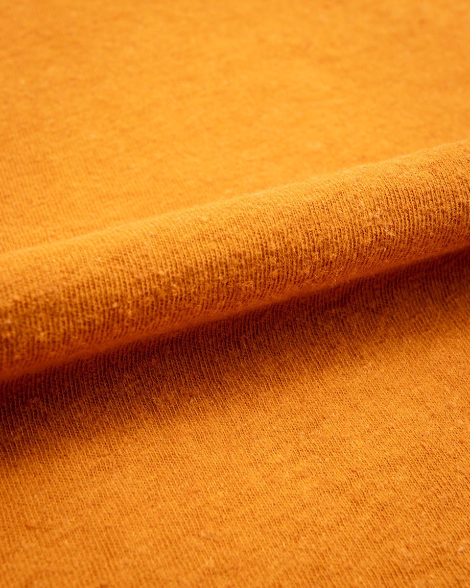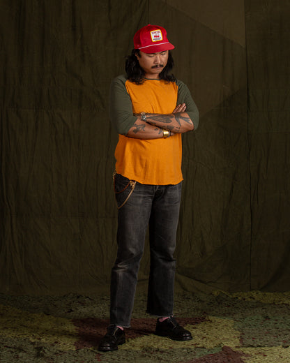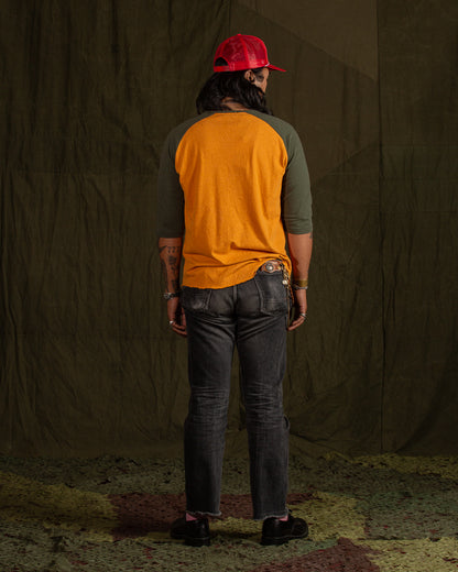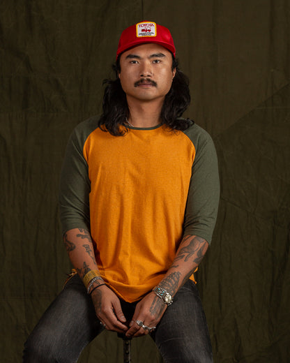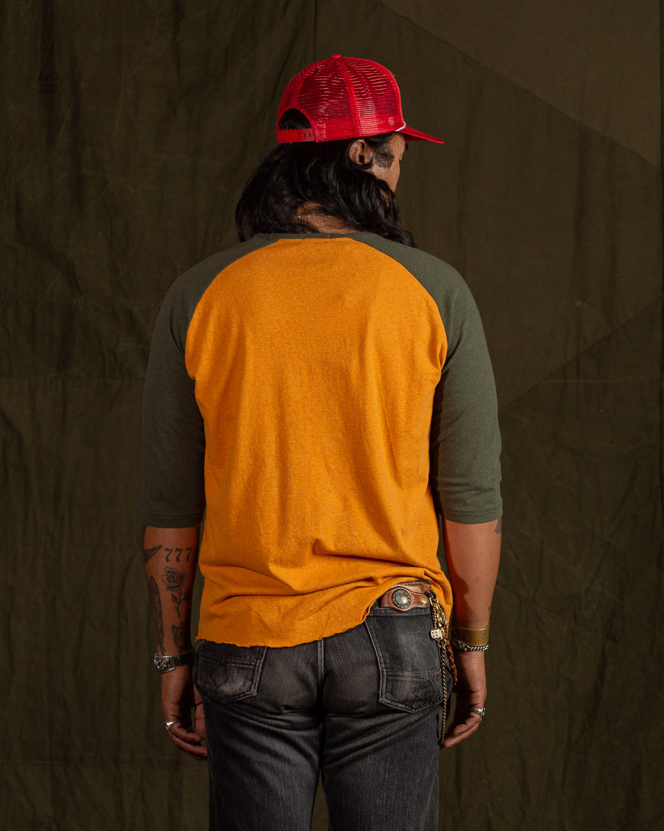 A model athletic shirt, this newest edition of the Leon shirt comes in a powerful two-tone configuration. The body is a warm safety orange, with raglan sleeves rendered in a drab forest green. Cut with a roomy body and sewn up with tonal stitching, you'll feel as good as you look wearing this (great).