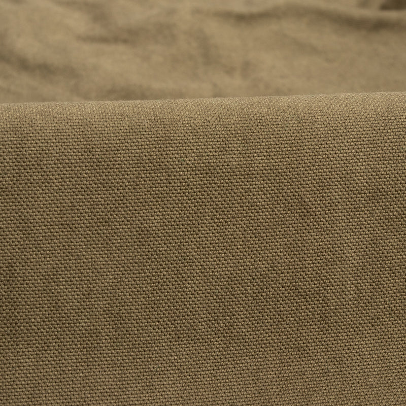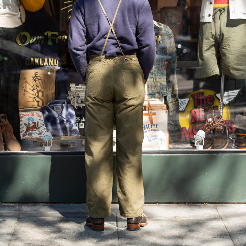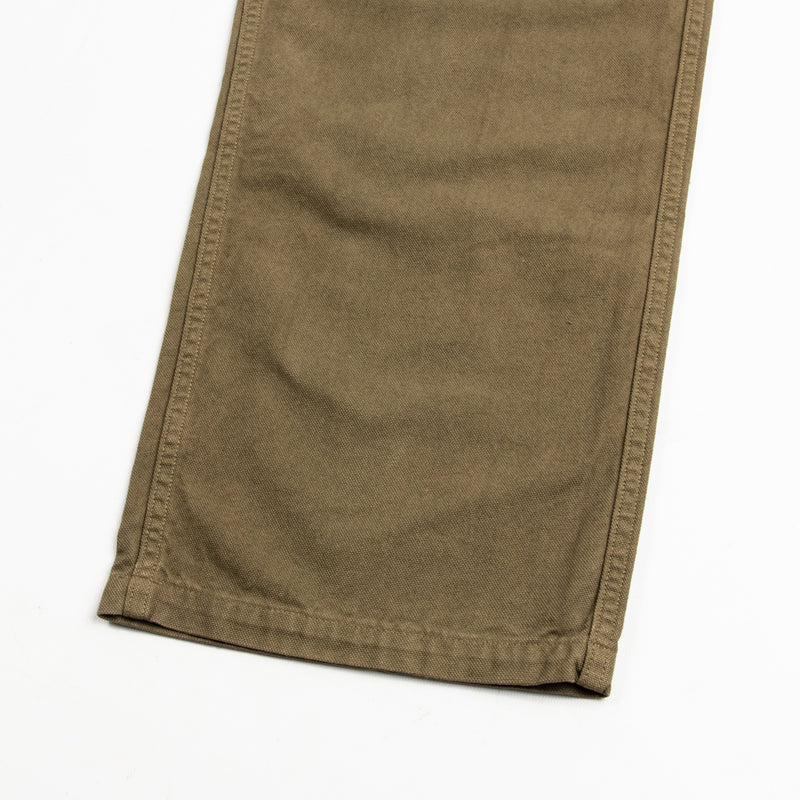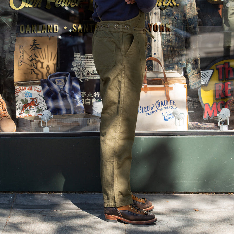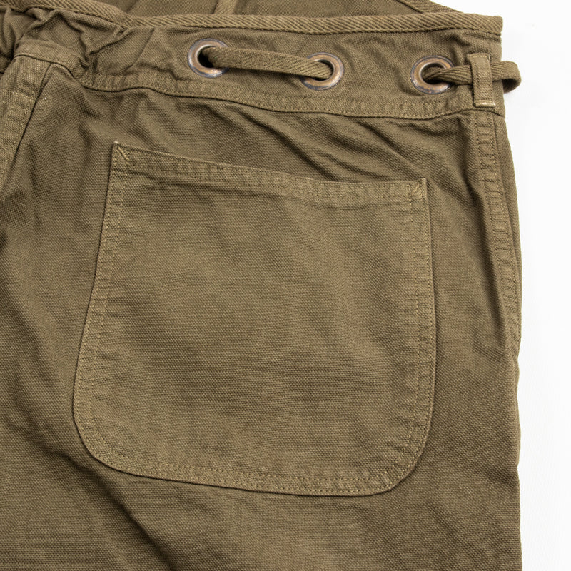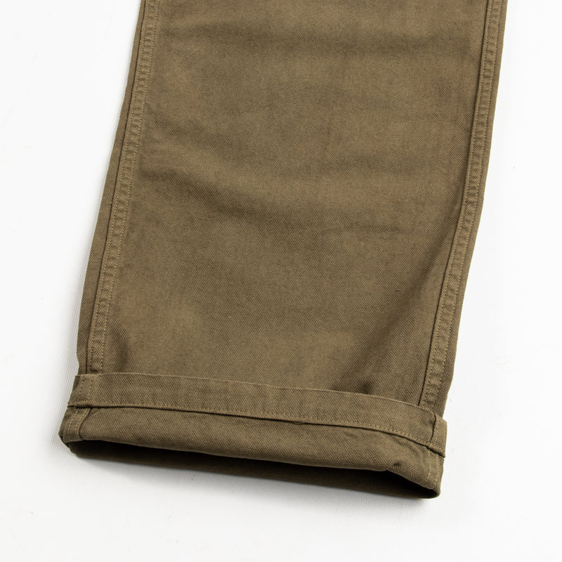 They're made from a sturdy 100% cotton twill, in a dark khaki green. These have been rinsed to account for initial shrinkage, but will continue to fade over time from wear and washing.
