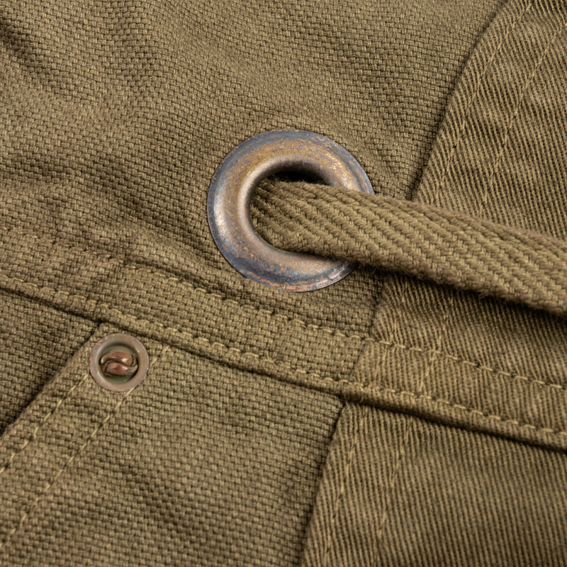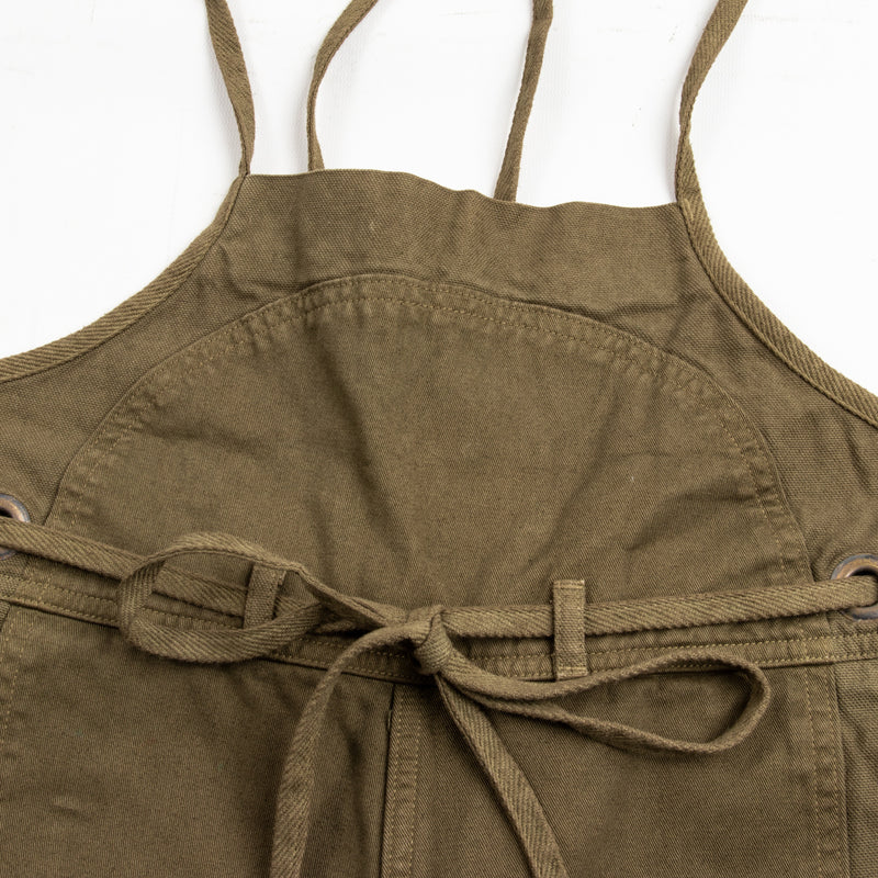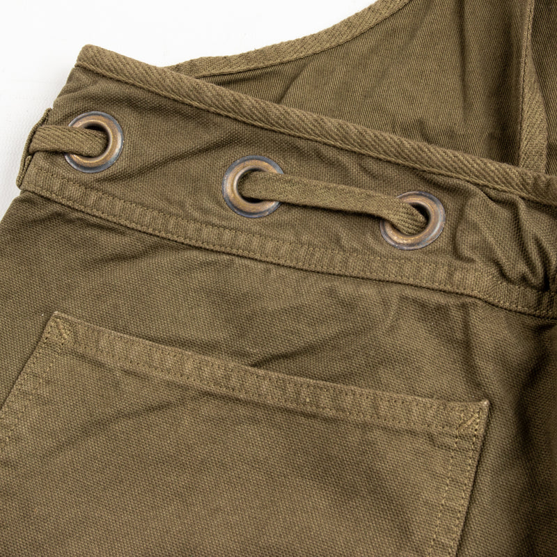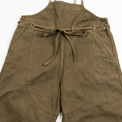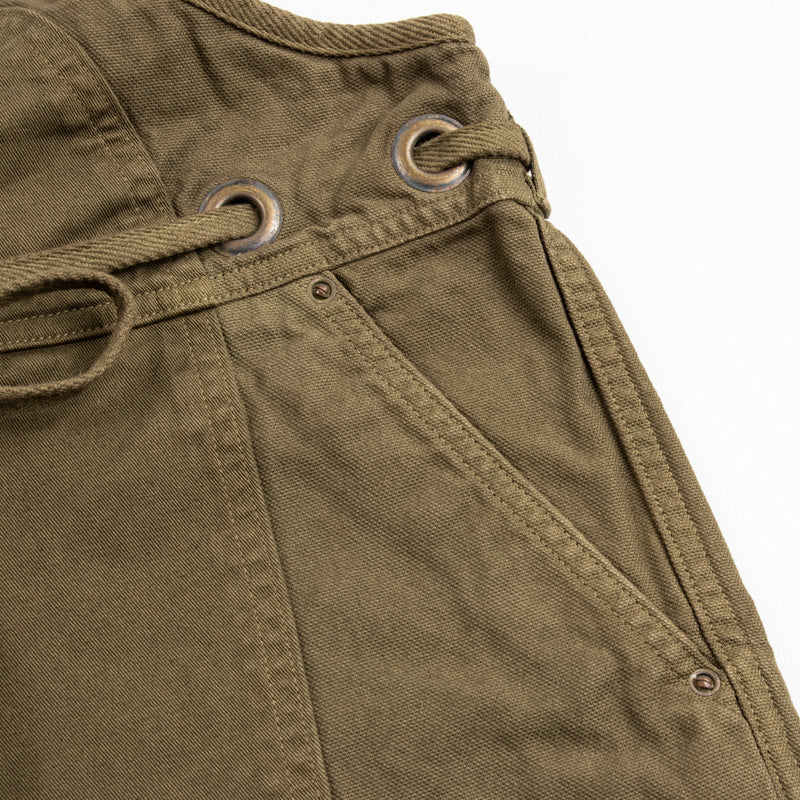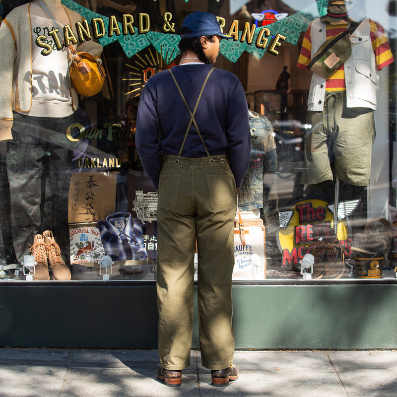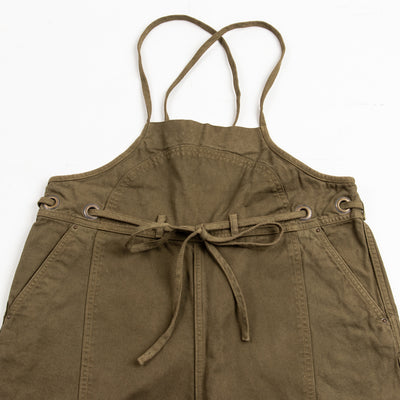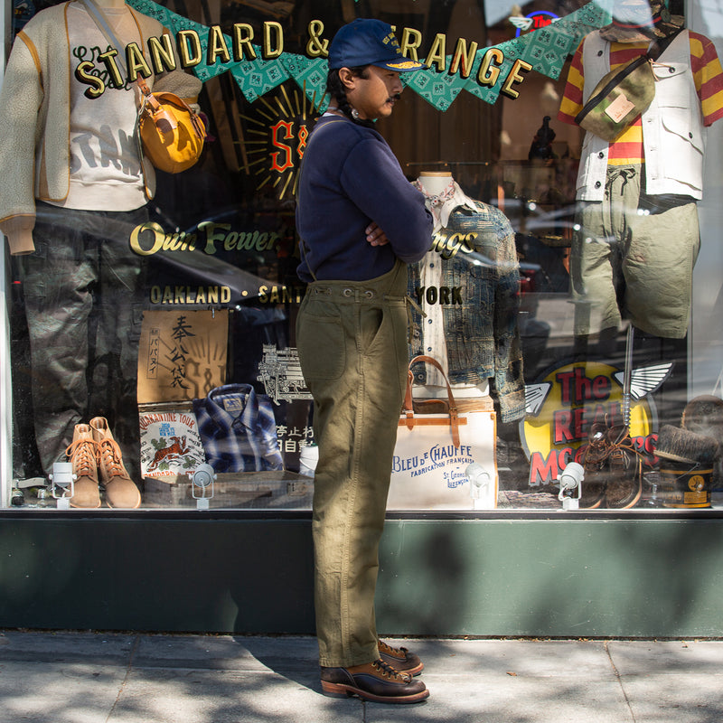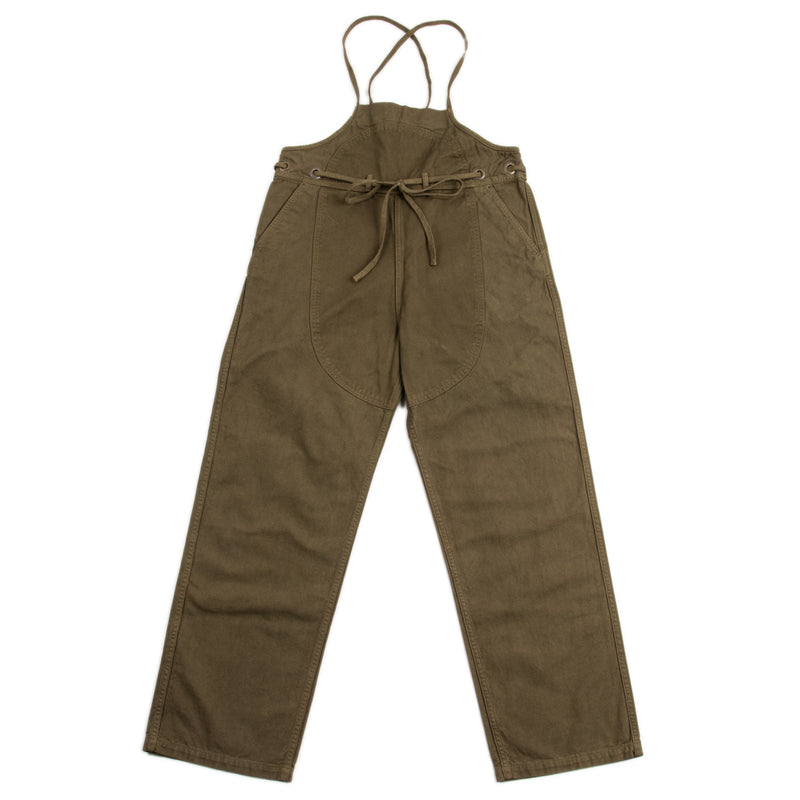 With a low front bib and four pocket configuration, the WELDER Overall is old school. Lacking any belt loops, the fit is adjusted with a tonal drawstring that also makes up the shoulder straps, threading through patinated brass eyelets. The front of the overalls feature an oval reinforcement, to protect from sparks and slag (don't actually weld in these).
