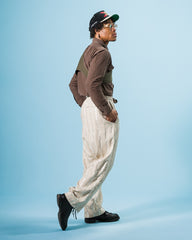 The fabric is a sturdy linen/cotton/poly blend with a weathered ecru body and reflective vertical stripes, it's got all the drape and comfort of a pure linen, with the extra soft hand of a worn cotton canvas. It's completely pattern-matched, keeping each stripe intact throughout the full length of the leg and across any seams or pockets.