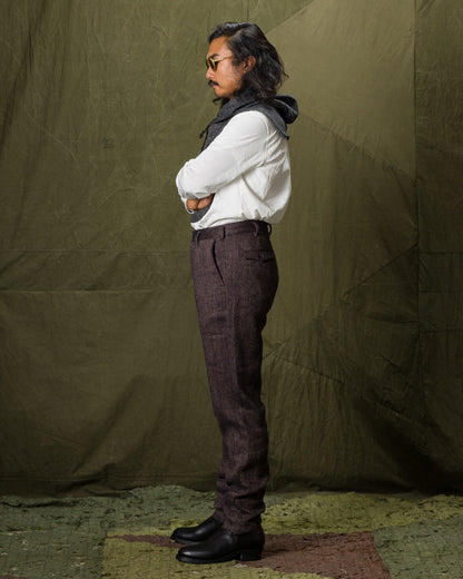 The Logan Trousers are a new style for A/W '24, taking tailoring and fit details from both the Roger & Yale trousers, two of 1st PAT-RN's best-selling and most popular fits. A perfect companion to the Horloger Jacket, they feature a high rise and an anatomically tapered leg with room throughout and a natural fit. They've got two slash front pockets and two more on the rear - one welted and one with a button flap.