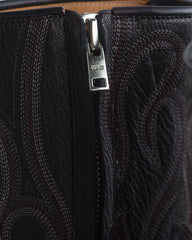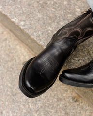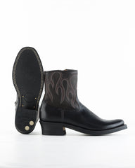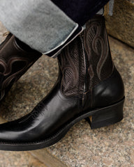 The shaft is sewn up from a tight grain textured goatskin, with flame embroidery around the entire thing. Shiny, supple, and stunningly detailed, the embellished shafts pair perfectly with the ornate "toebug" stitching, western vamp, and the stellar construction.