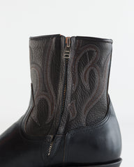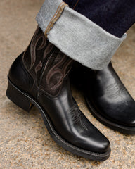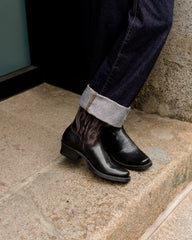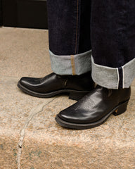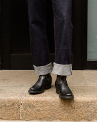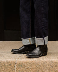 The Loro were inspired by hard wearing Western Roper boots, with a sleek profile and slender shaft. Featuring a double row stitchdown construction, an antique brass side zip, and a raised logger heel, they're handsome and hard-wearing, but will only get better over time as the black dye at the surface of the leather wears down and reveals the brown core underneath.