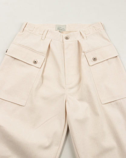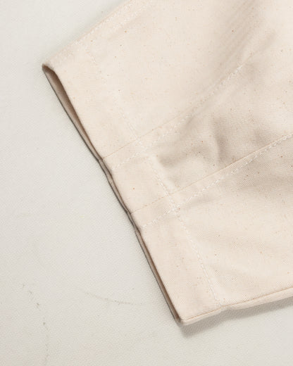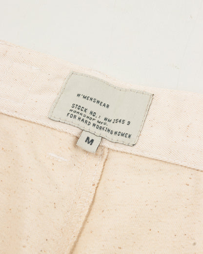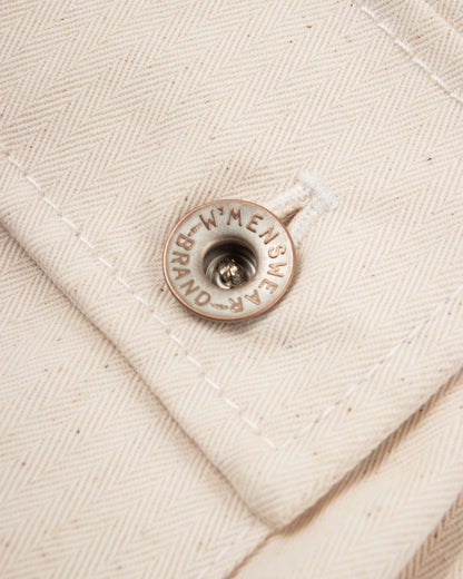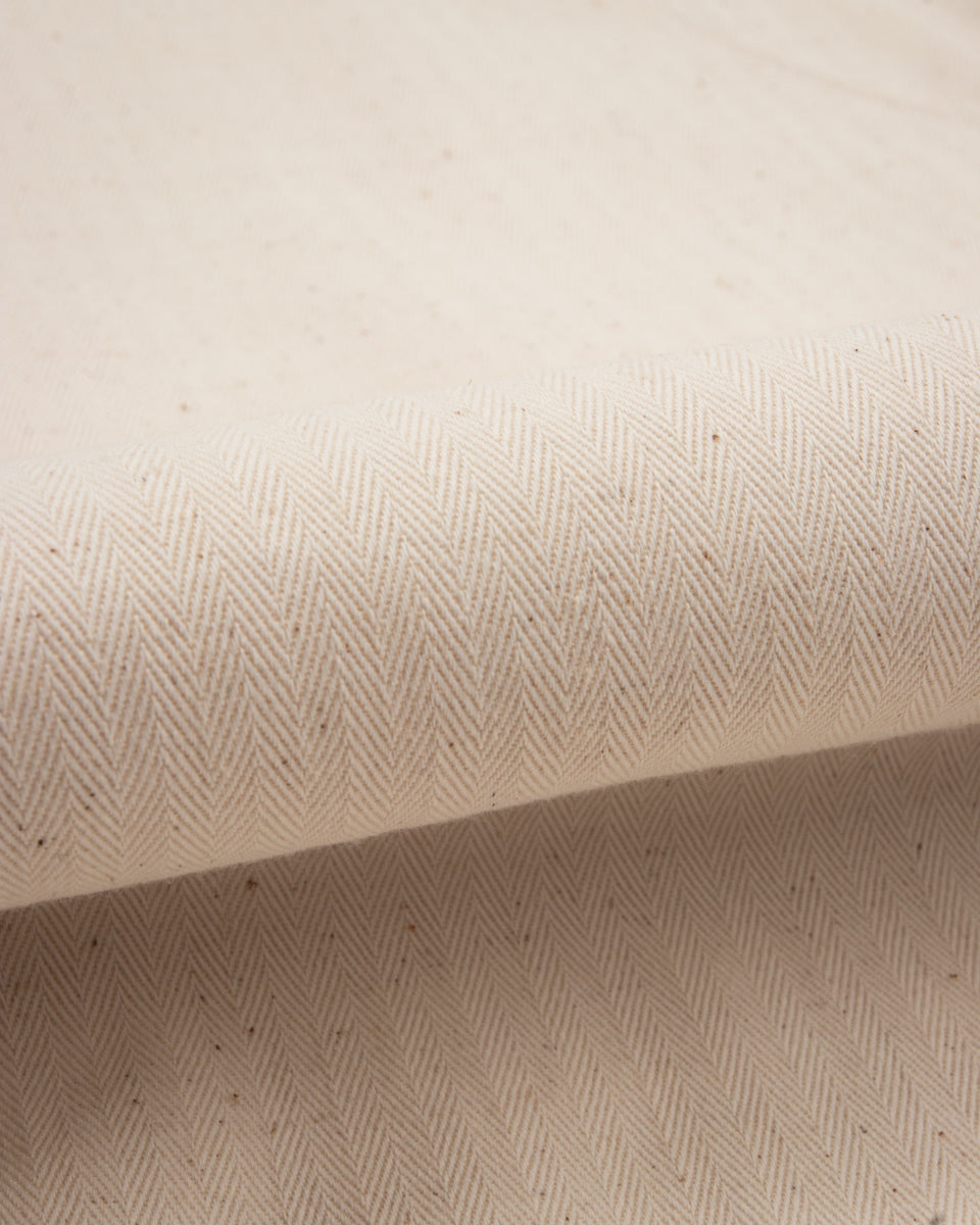 They're made from an off-white cotton herringbone fabric, milled in Thailand, it's finished with a rinse to soften things and remove any initial shrinkage. Sitting at a comfortable medium-weight, the herringbone weave breathes more easily than other cotton fabrics, making it ideal for warmer weather.