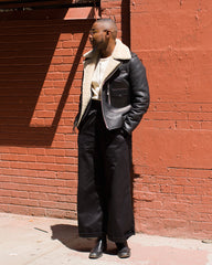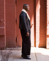 It's cut slightly larger than your standard motorcycle jacket to account for the thickness of the shearling body, but the silhouette is still comfortably-fitted, with a cropped torso and snug waist. The placket is asymmetrical, with a zipped double-breasted front that can be worn open to show off the iconic double rider lapels, or zipped fully for extra warmth and wind protection. The back features a complex pleated-and-gusseted action back design to help with freedom of movement, making the jacket easy to wear even before it's been broken-in.