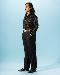 For extra durability, the entire garment features double row stitching, ensuring maximum longevity and reducing the likelihood of seam failures. Everything closes up with iridescent cats eye black pearl shell buttons, a fitting pairing with the elevated dark herringbone fabric.