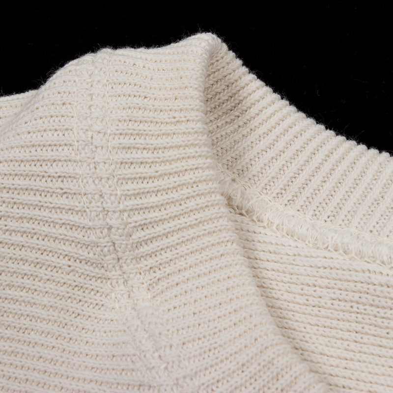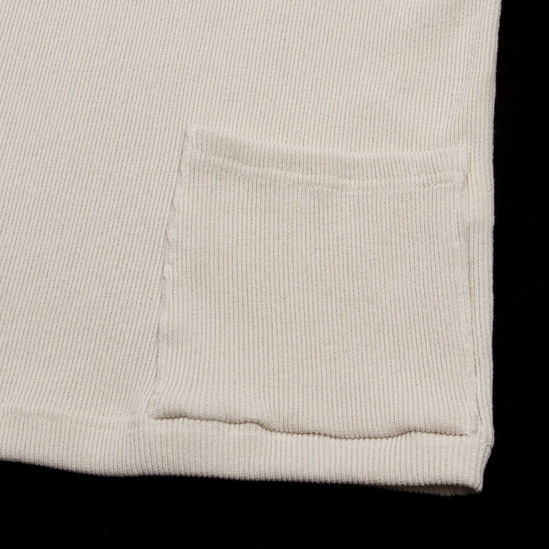 The fabric is a very dry and loosely knit 100% cotton, that stretches and relaxes easily into shape. The heavy nature of the knit gives the jersey a pronounced heft and drape, with the reinforced yoke serving to help support everything hanging beneath it.