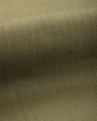 The Real McCoy's reproduced the "shade 7" dark olive green herringbone twill used in the original, along with the laurel leaf shank buttons. The construction is far better than the originals, which were hastily cranked out for the wartime effort, which allows the utility of this jacket to really come through. The collar can be worn open or closed; as can the sleeves, allowing as much or as little ventilation as the wearer wants.
