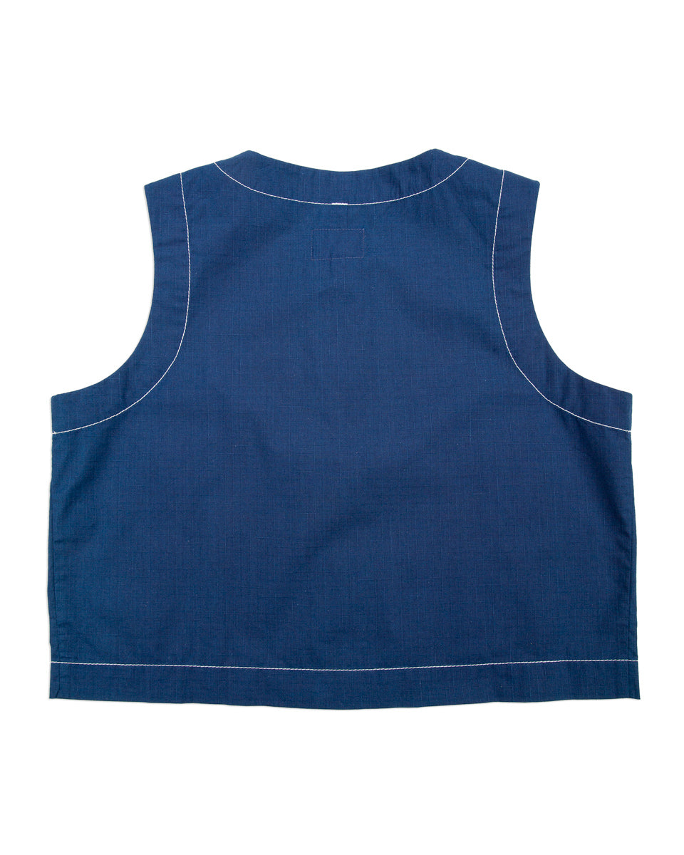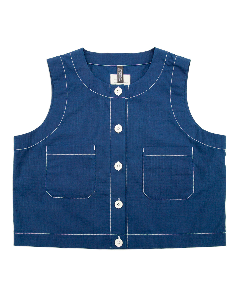 The Naa Shirt is a cropped, sleeveless button up with a slightly boxy fit and rounded collar. Cut with a simple five button placket, the front also features two utility pockets, while the back is constructed with a clean, one-piece design. Not much to add beyond that, it's a simple yet exceptional warm weather piece, with a surprising amount of layering potential and stylistic versatility.
