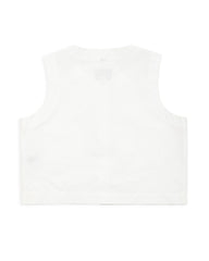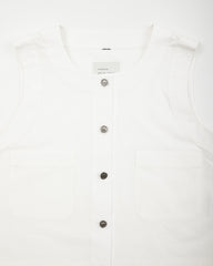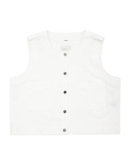 The Naa Shirt is a cropped, sleeveless button up with a slightly boxy fit and rounded collar. Cut with a simple five button placket, the front also features two utility pockets, while the back is constructed with a clean, one-piece design. Not much to add beyond that, it's a simple yet exceptional warm weather piece, with a surprising amount of layering potential and stylistic versatility.