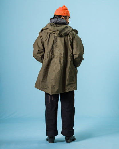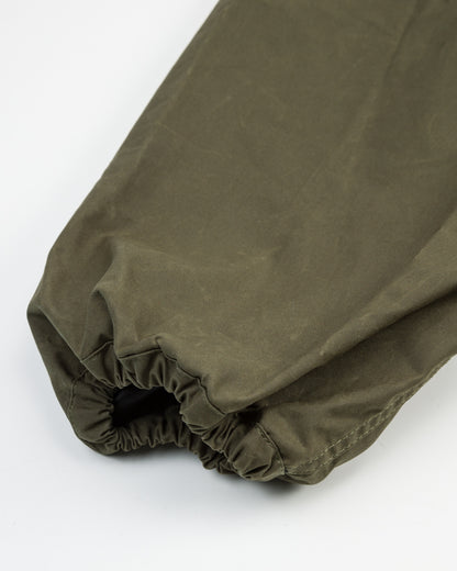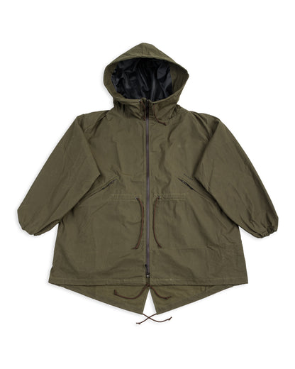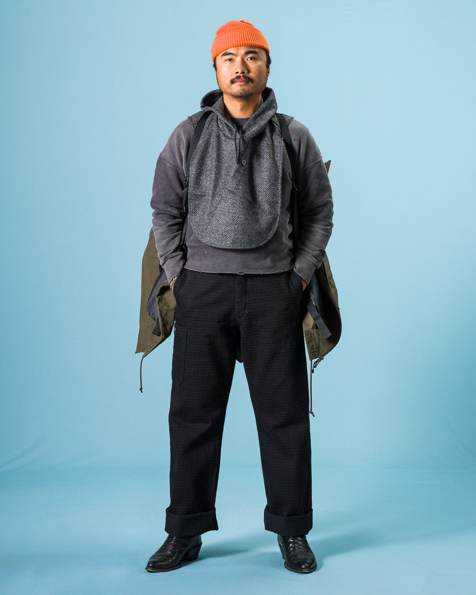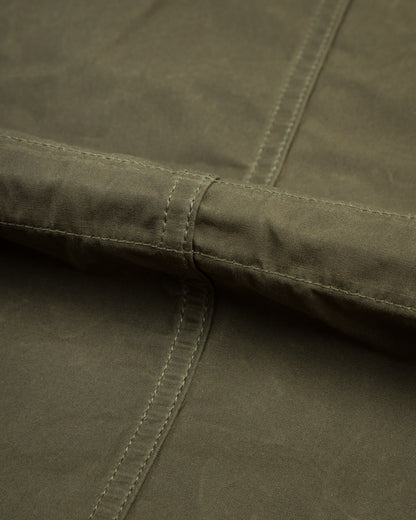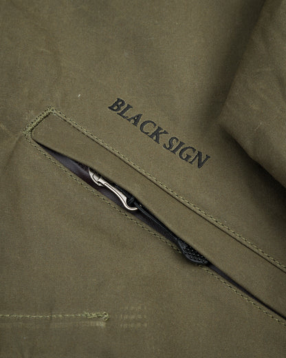 It's made from an oiled 100% cotton fabric from British Millerain, a world-renowned manufacturer of oiled and waxed fabrics since 1880. This particular fabric is the flagship of Black Sign's "oiled cotton" series, finished with the mill's proprietary (and secret) solvent for water resistance, additionally imbuing the fabric with a unique texture that will patina dramatically over time, forming "chalk marks" and creases with wear. Slightly stiff at first, it's a pleasantly sturdy and robust fabric that will also relax with time, taking the shape of the wearer's body.
