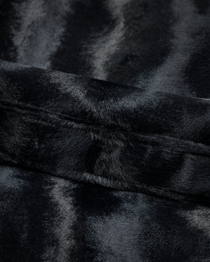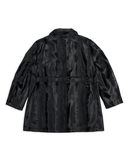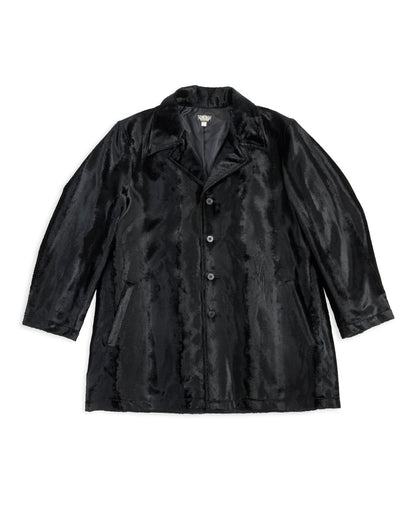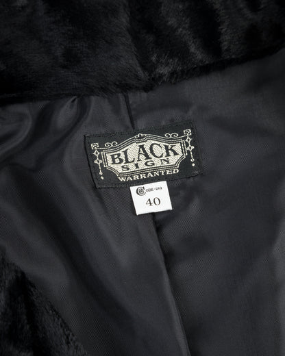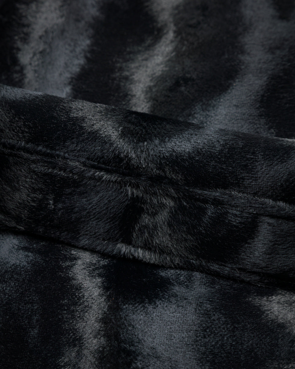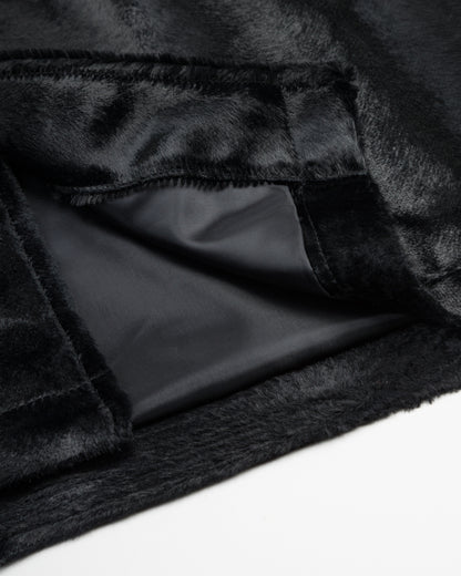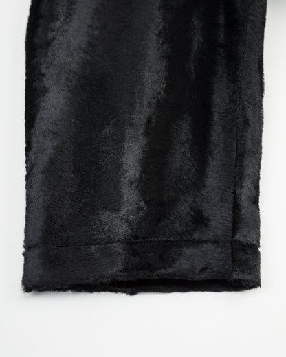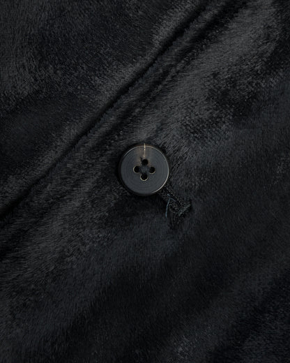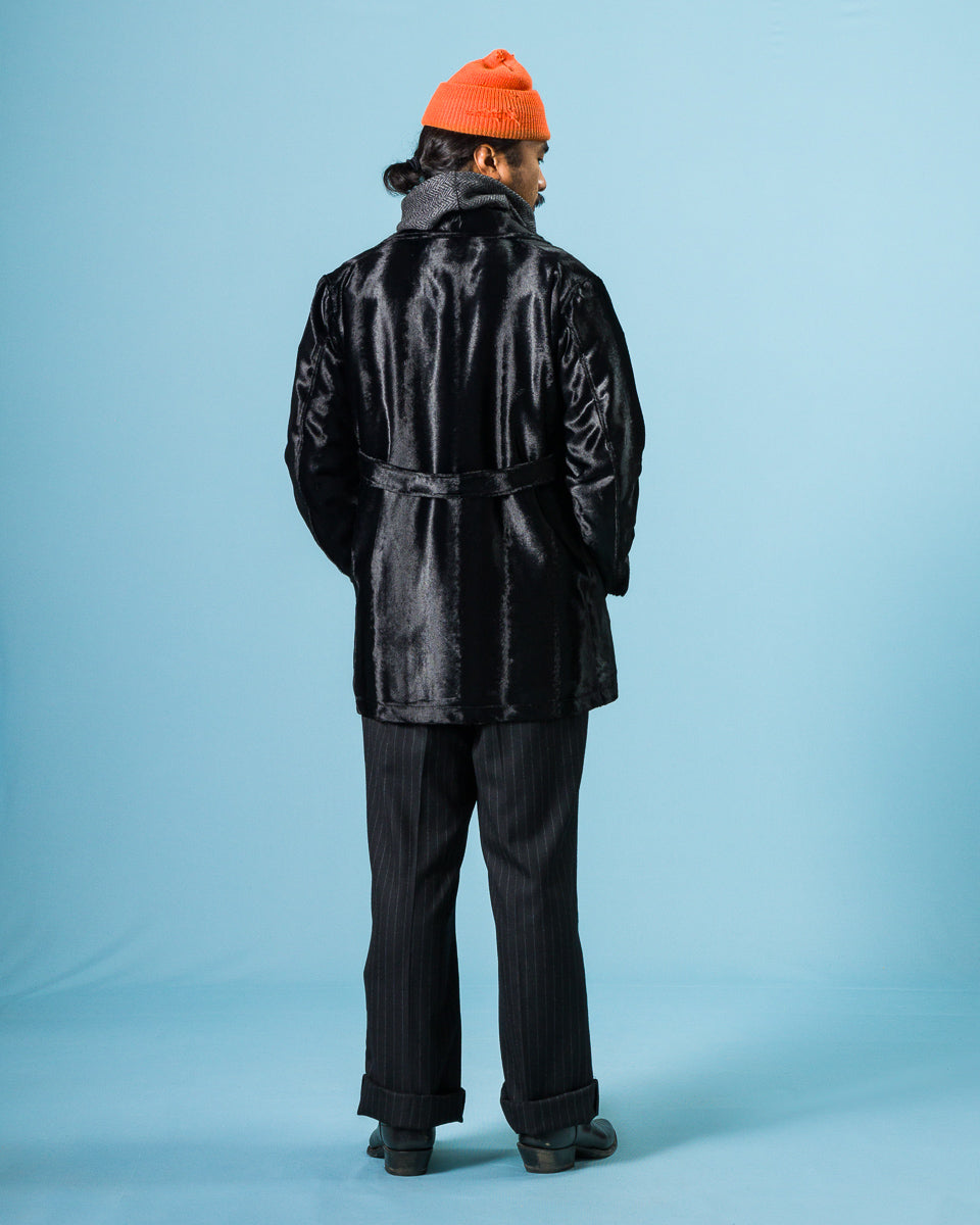 It's made from Black Sign's "Shine Black" rayon pile fabric, an extremely soft and textured textile with great heat retention. The outer face very fine, with dark black "hairs" that feature a gentle luster throughout that is designed to imitate hair-on-hide leathers. The front closes up 4 large buttons, and the inside face of the fabric is kept smooth for additional comfort.