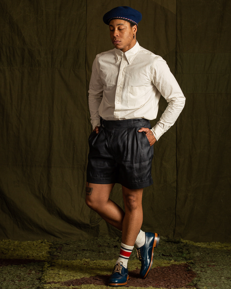 The Oblique Shorts an a very covertly complicated garment, in that their understated appearance hides the incredible tailoring details that they're just packed with. These are Motiv's take on an Eastern "Mien" fly construction, with a high rise, wide leg fit and two inverted pleats down the front that remind one of gurkha shorts. The waistband is secured with a wrapped front fly and integrated D-ring belt, allowing these to adjust through the waist and comfortably fit a significant range across each size without ever looking too large or too small.