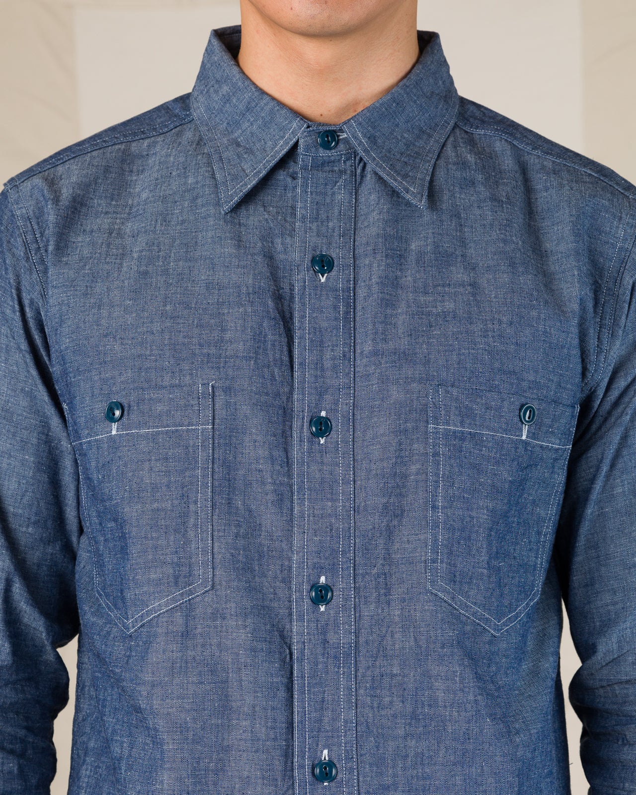 It's made from a handsome 100% cotton chambray with an irregular and slightly slubby surface texture. Crisp and breathable, it will soften over time from wear and washing, fading slightly too. It all closes up with urea buttons, a nod to the originals, with fun additional details, like selvedge side gussets and contrasting stitching throughout.