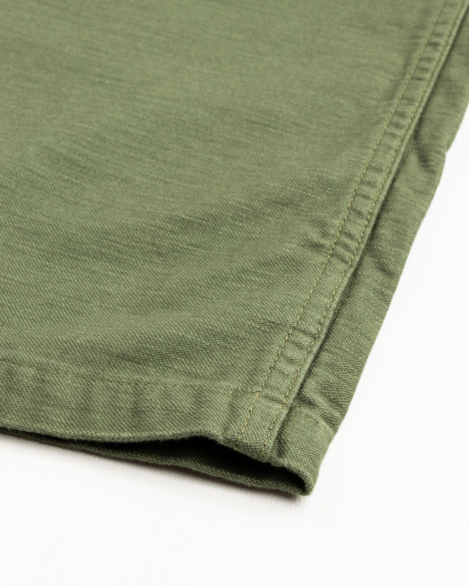 The fabric is a custom heavy reverse sateen made exclusively for OrSlow, sewn up in a trim, but not slim block, and then washed down for comfort. The buttons are period correct, dyed to match.