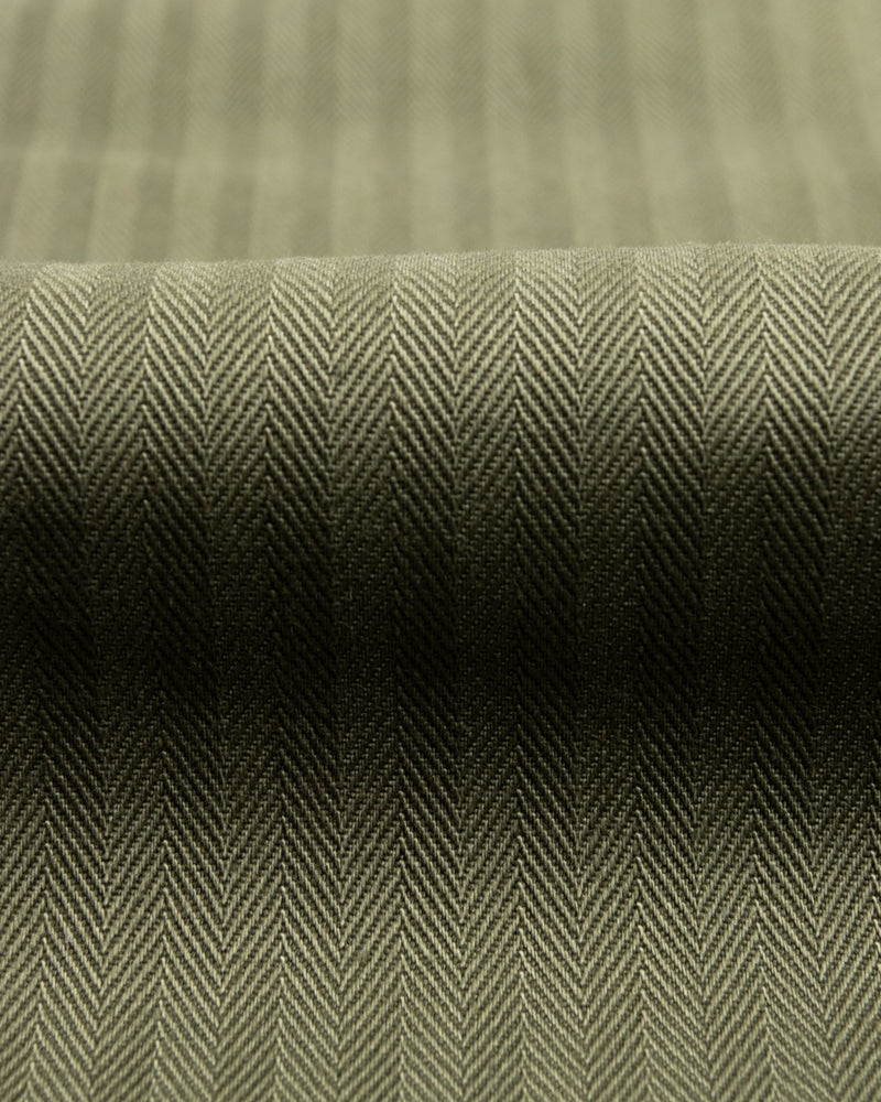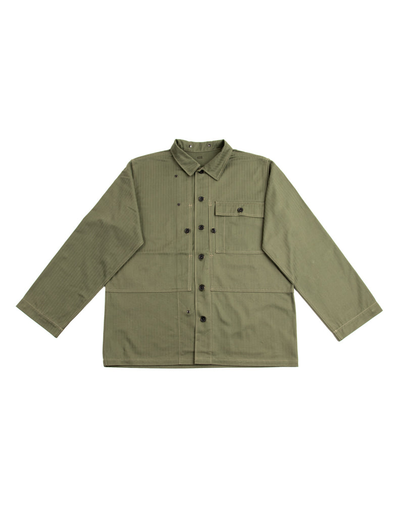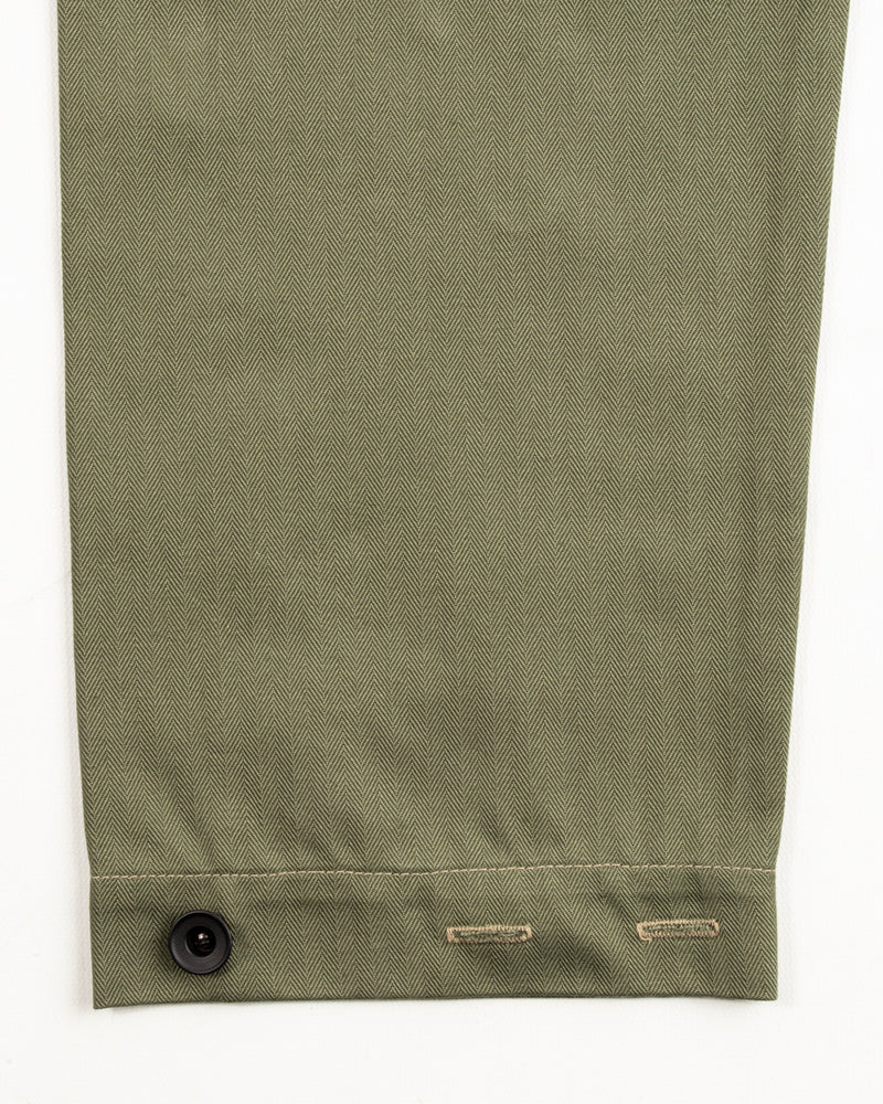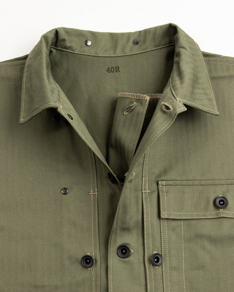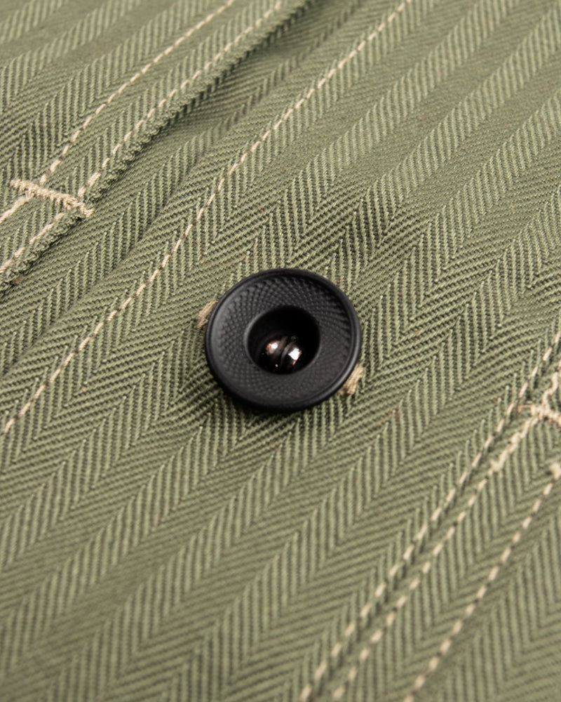 Sewn up from The Real McCoy's 100% cotton olive HBT fabric (herringbone twill), an ultra-high quality reproduction of one of the most ubiquitous military cloths of the last century. Comfortably medium weight, it's crisp but surprisingly breathable thanks to the herringbone weave, breaking in and softening substantially over time. Olive drab herringbone fabric was the US armed forces replacement to standard issue denim and khaki garments, faring better across a greater variety of combat theaters and eventually becoming the most commonly worn fabric during the second half of WWII.