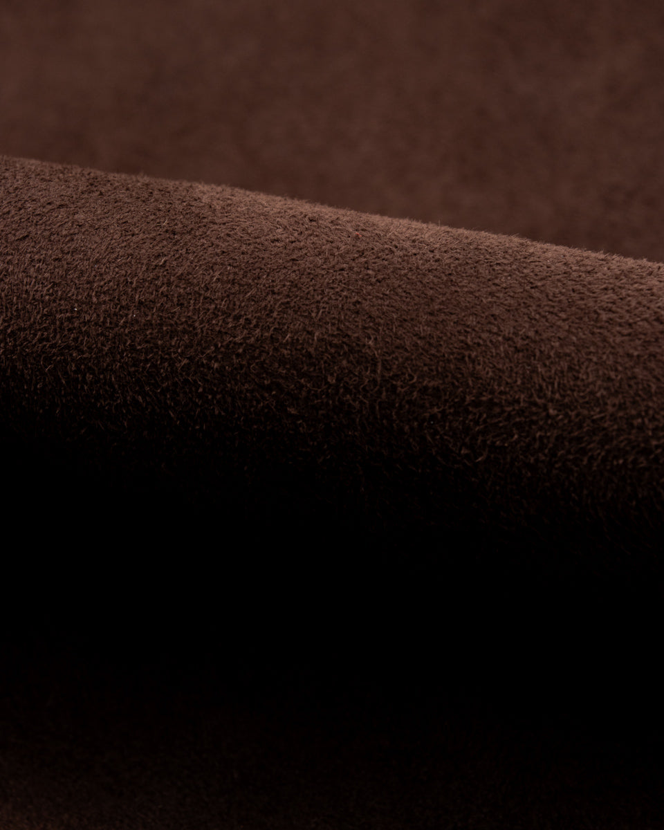 It's made from a chocolate brown "reverse" goatskin - which is to say that they flipped the hide so that things are suede-side-out and smooth-side-in. Tanned by Tustin & Burnett in England, it's immediately soft and comfortable, requiring virtually no break-in and quickly taking the shape of the wearer's body. Over time, the suede will wear down to a more smooth texture in areas that regularly experience abrasion, developing a unique and handsome patina.