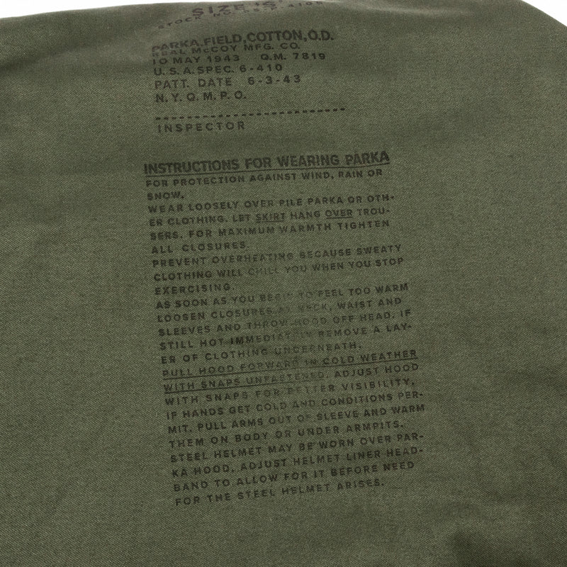 This particular garment is a reproduction of a U.S. Army parka from World War II. The official name is, in fact, "Parka, Field, Cotton, O.D.", breaking out of the usual numbering system. These are rarely seen, which makes this a very special release.