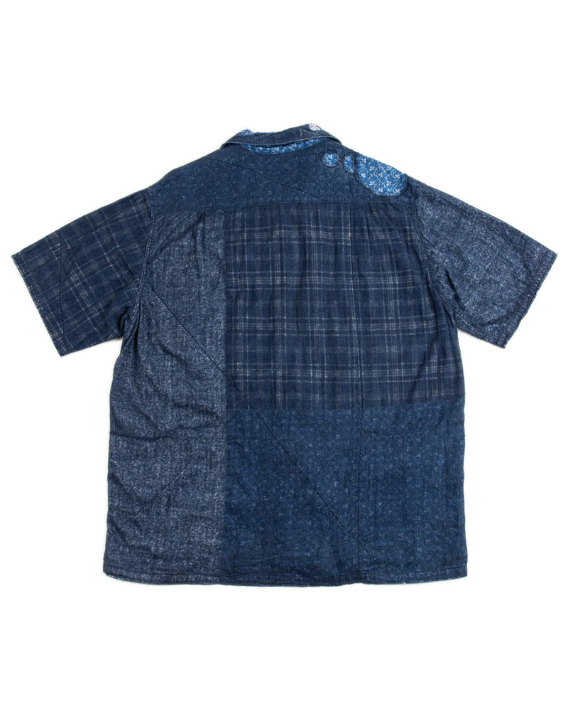 Throughout the garment, in addition to the multiple different fabric patterns and patchwork construction, there are also hand distressed points that have been given custom boro repairs to. The chest has two pockets for storing your keys or sunglasses, and the aloha collar really cements the whole thing as a garment for comfort and leisure. As a reminder, these are handmade items, and each individual garment may have subtle variations from the one pictured.