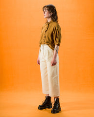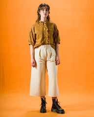 The Play Shirt is aptly named, with a design that's both stylish and fun taking inspiration from the illustrations of Mary Petty, featuring balloon sleeves and ruffle details at the collar, placket, and cuffs. With a fairly natural fit through the torso, the silhouette is exaggerated beyond the shoulders, terminating in short sleeves that are perfect for hot weather. Even with the embellishments, the overall cut is relaxed and easy, great for layering, but also great on its own.