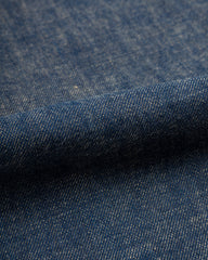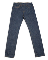 This batch is made from a custom 13oz Japanese denim, dyed with a lighter natural indigo warp and vintage-style beige weft yarns. Not only does it start out a little lighter than other raw denim jeans, but it'll produce more low-contrast vintage-style fades that look a little more worn in more quickly. The fabric is sanforized, and was finished for a rinse to help soften things up — so minimal shrinkage is expected with a cold wash and hang dry, and you should take your usual size.
