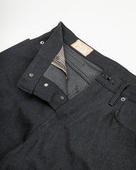 This pair is sewn up from Yoshiwa Mills 14.25-Ounce black warp, grey weft selvedge denim. This fabric has a more matte appearance initially, though as the black and gray yarns fade at different rates, the denim will take on a slightly more shiny appearance, before finally fading to a cool gray all over. This process will be slow and subtle, but very rewarding.