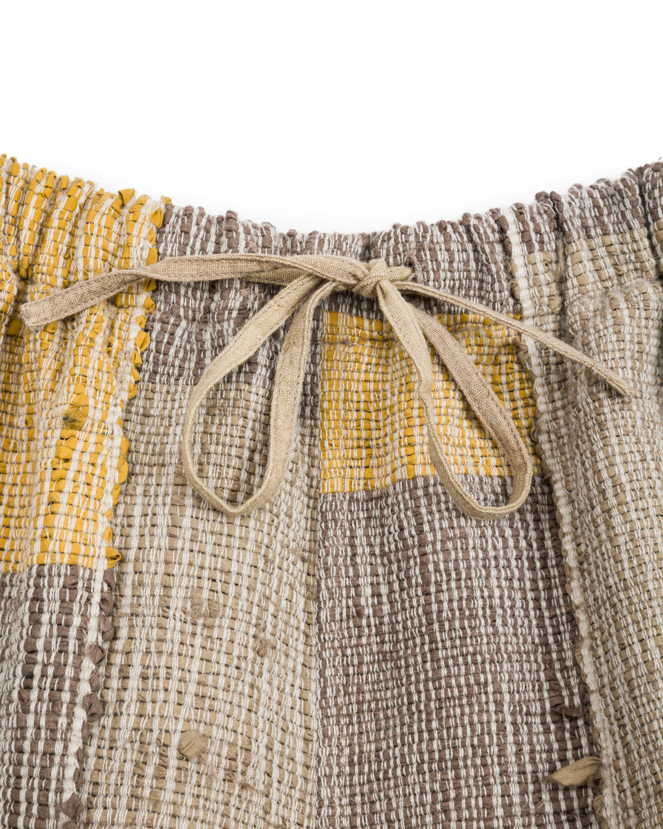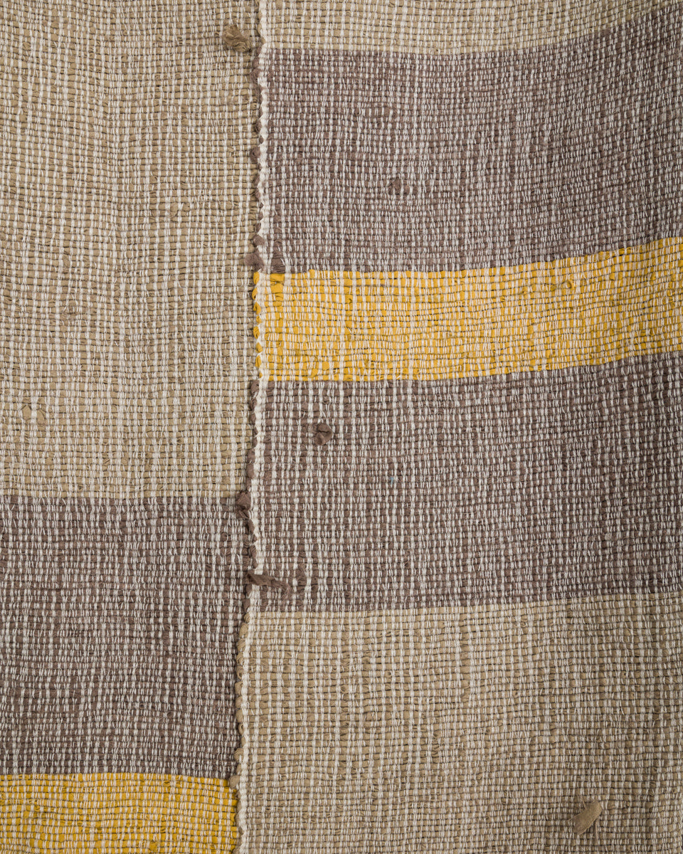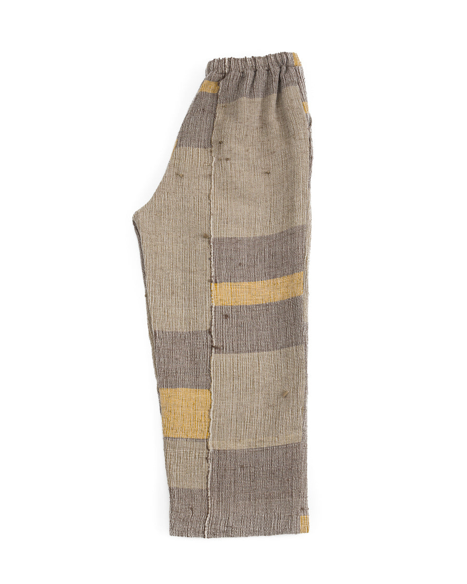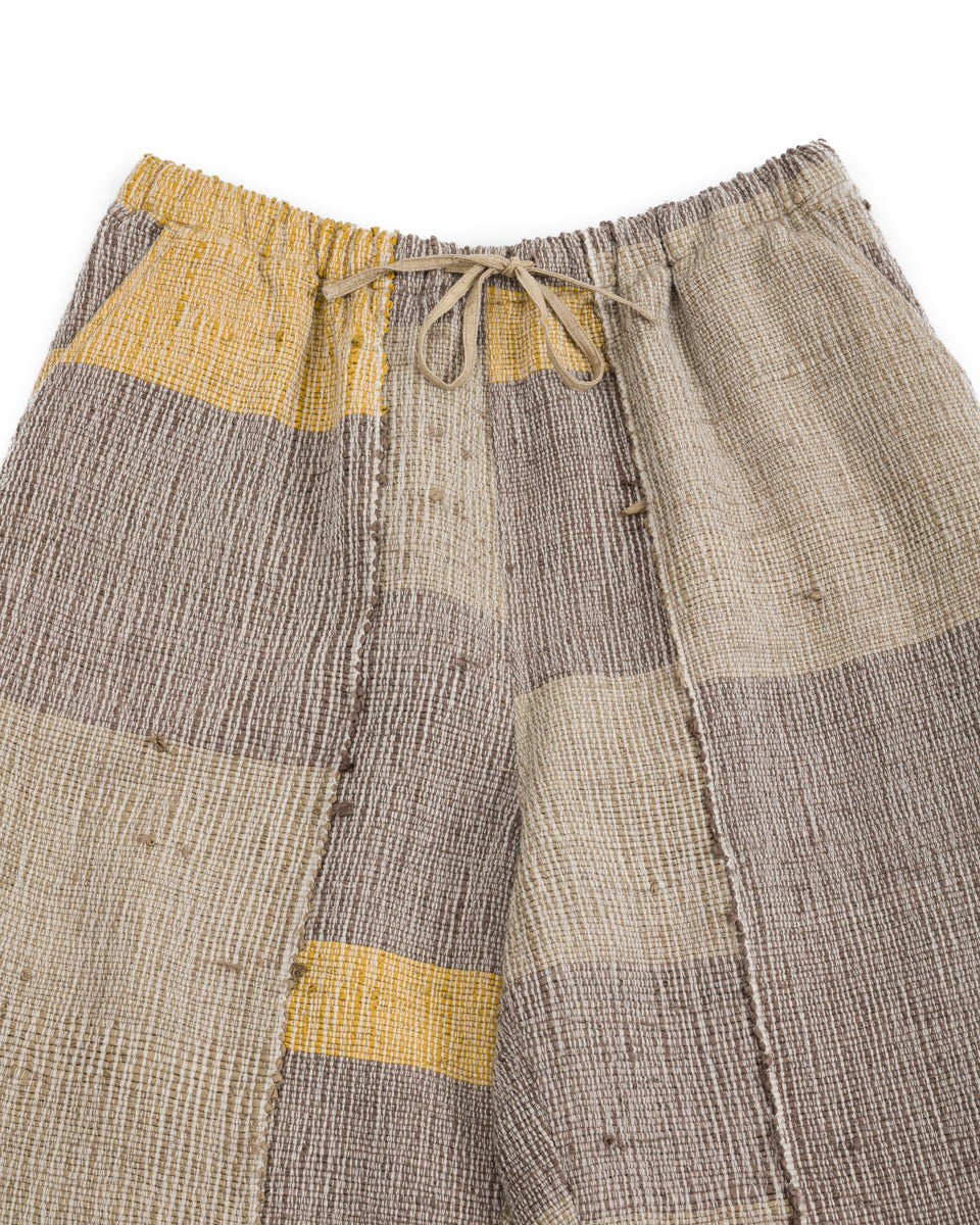 They're made from a patchwork blend of 60% cotton and 40% silk textiles, with various warm gray tone and gentle yellow sections derived from natural dyes. Both airy and substantial, it's got an excellent heft and drape, but still breathes well thanks to the lower-tension weave of the body. Due to the patchwork nature of this garment, no two are exactly alike, and yours may different slightly from what we've photographed.