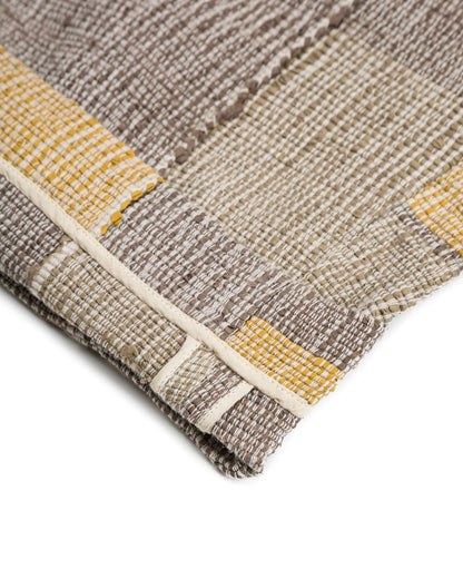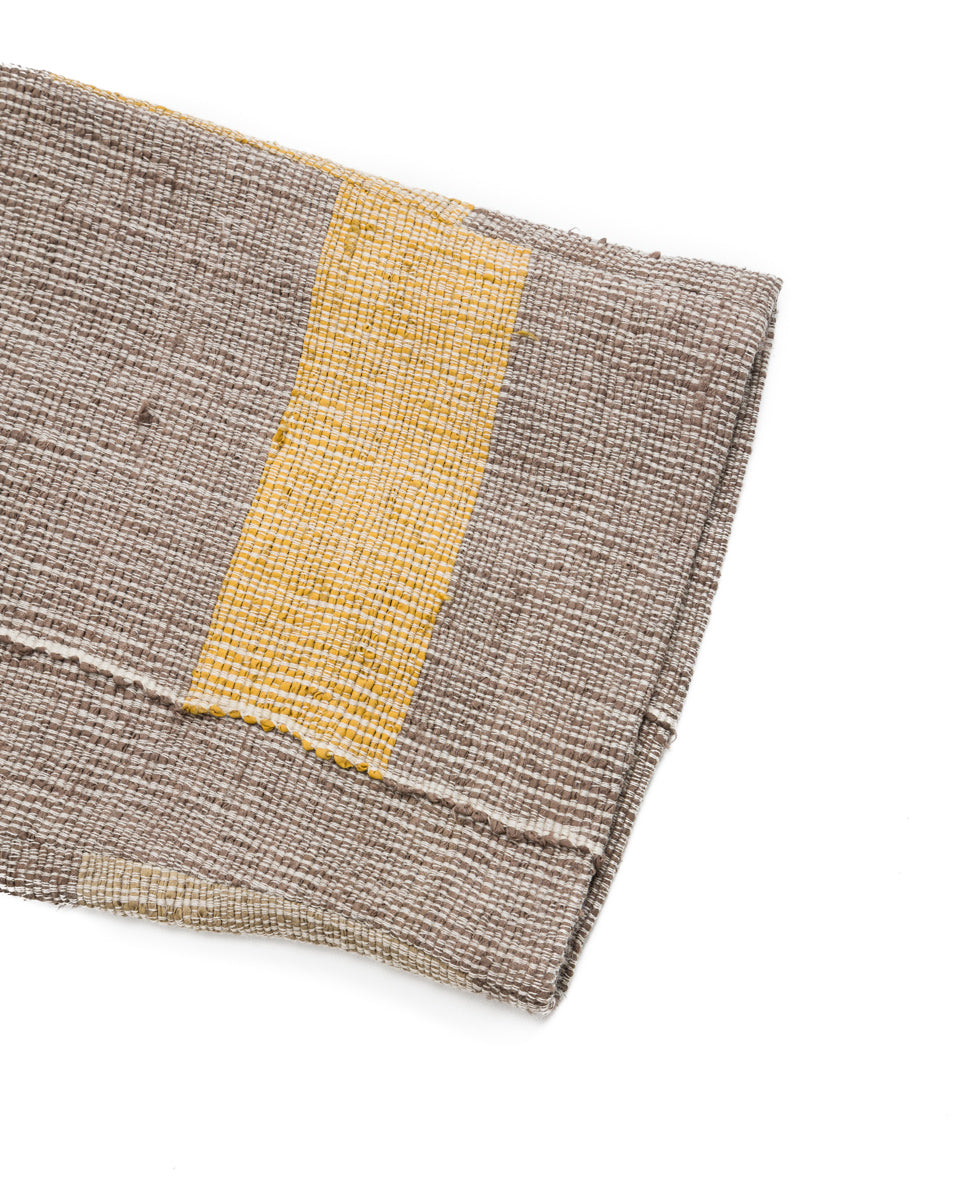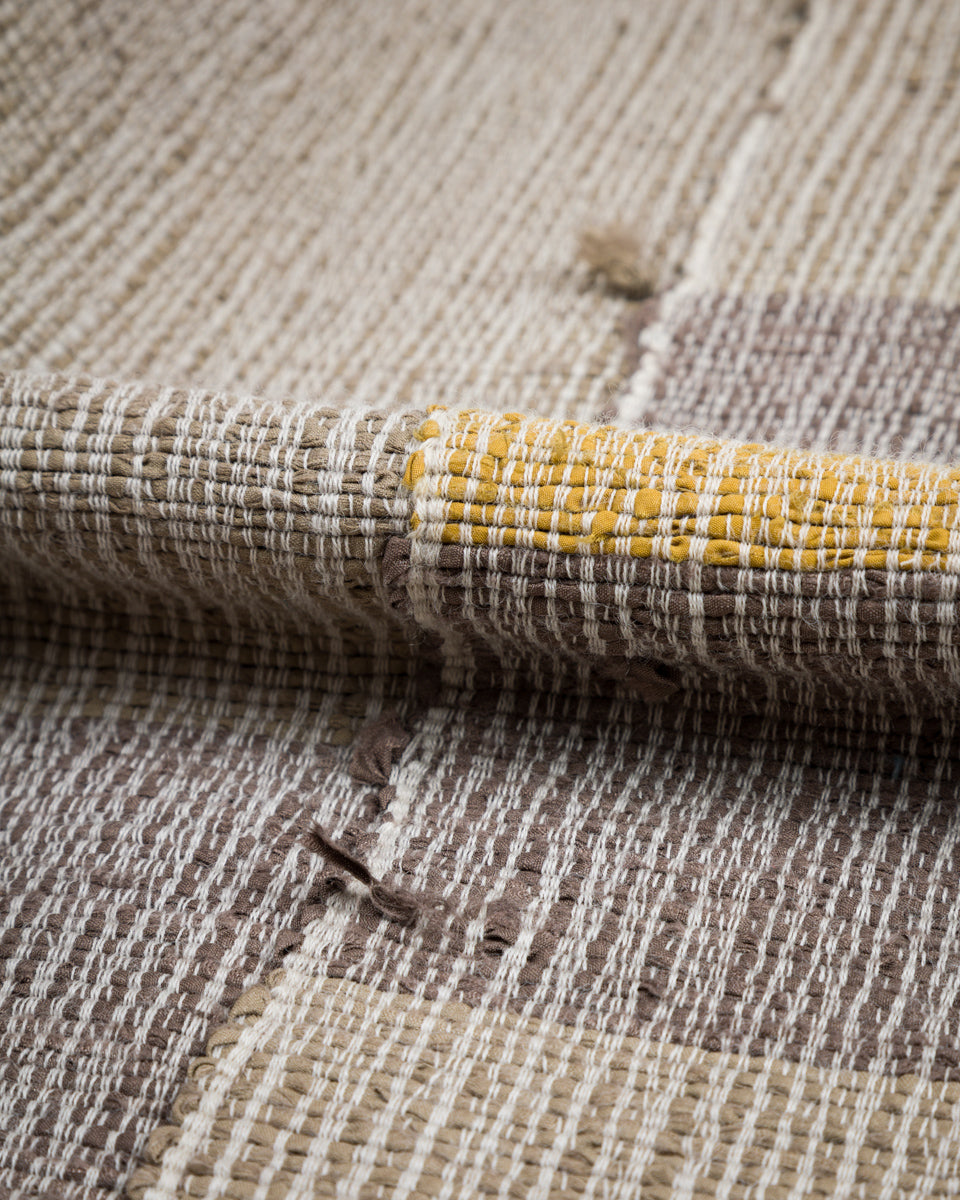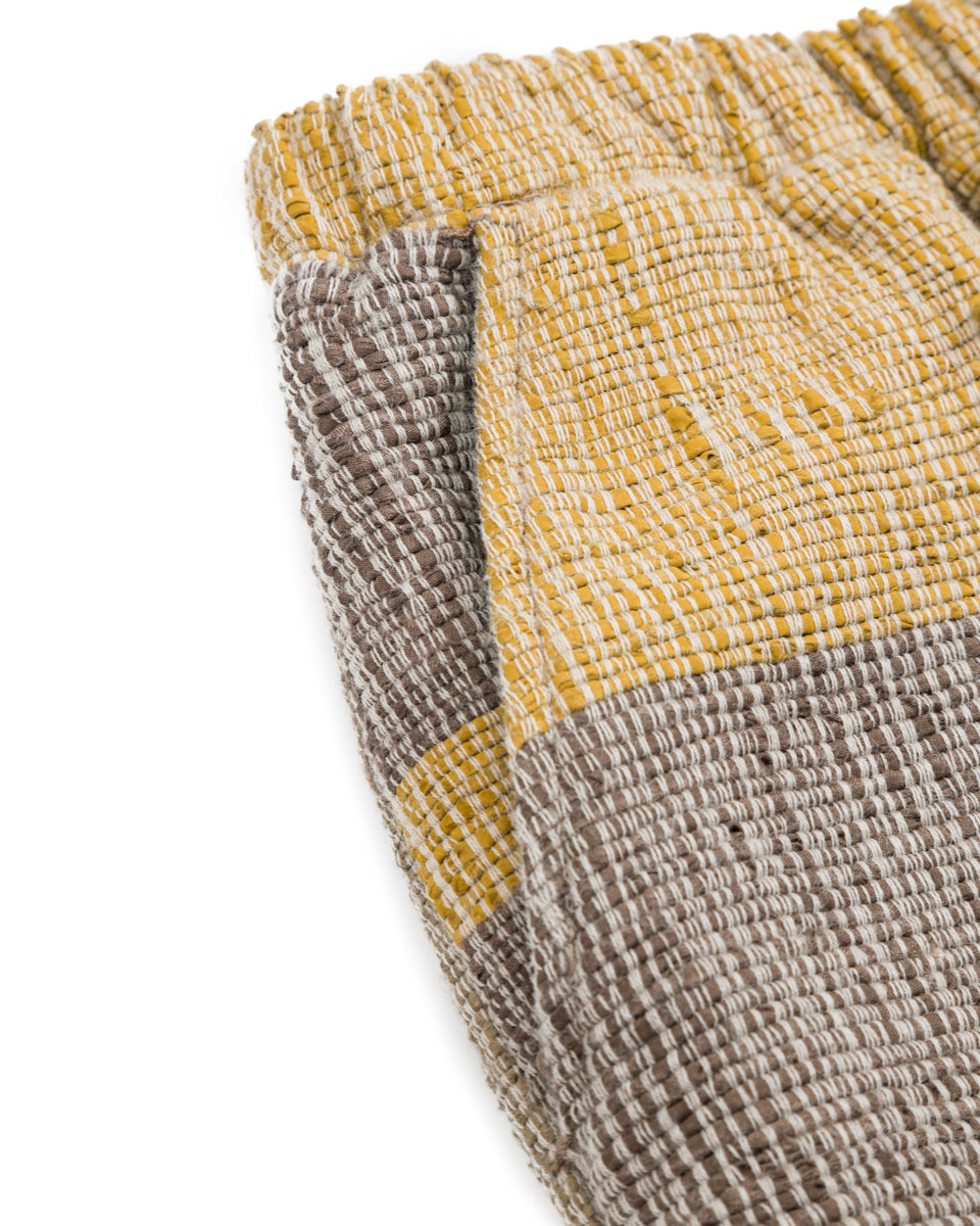 They're made from a patchwork blend of 60% cotton and 40% silk textiles, with various warm gray tone and gentle yellow sections derived from natural dyes. Both airy and substantial, it's got an excellent heft and drape, but still breathes well thanks to the lower-tension weave of the body. Due to the patchwork nature of this garment, no two are exactly alike, and yours may different slightly from what we've photographed.