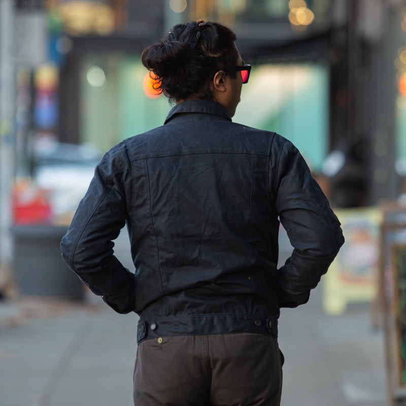 Cut as a functional Rider's jacket, it's got an elasticated action back, giving you the best of both worlds - full mobility through the sleeves and shoulders as well as a handsome, fitted silhouette. The hardware is all custom, which is really fitting for a jacket of this caliber, and the seams feature Freenote's usual heavy-duty 1/8" double-needle stitching for maximum durability.