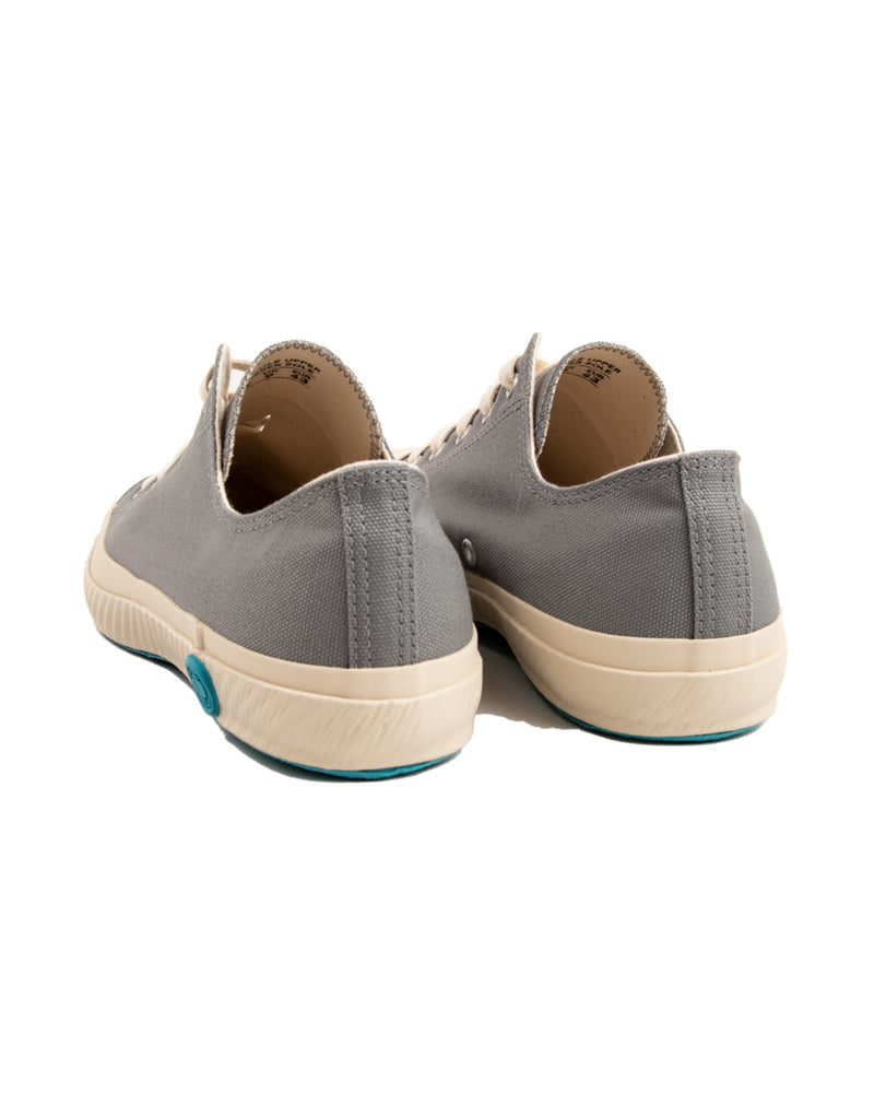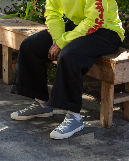 The uppers are a sturdy cotton canvas, with stainless eyelets and soft woven laces, sewn up in a minimalist low top style. They're finished with tasteful but minimal branding, a single teal rubber stamp on the outside heel and a matching blue sole that distinguish these as Shoes Like Pottery rather than mainline Moonstar sneakers.