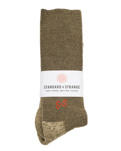 We've had them "cut" to mid-calf length, perfect for any boots from chukkas to engineers, with a cushioned foot bed, a reinforced heel and toe, and a snug fit with additional shaping through the arch. The shaft is knit in a true rib pattern for maximum comfort and to stay secure around your leg, and each pair features a mini "S&S" in our favorite safety orange on the ankle, tastefully beneath what the vast majority of boots will cover.