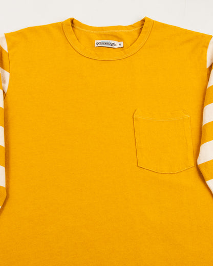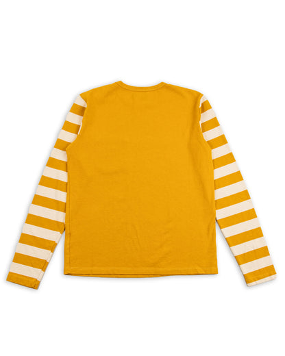 The cut is pretty stellar, long enough to wear tucked or untucked without looking confused, while the chest is just roomy enough to move freely in, but cuts a clean silhouette. The sleeves are done in a yarn-dyed horizontal stipe pattern (could be vertical, depending on how you look at it too, I suppose), as a result of the yarn-dyeing, the stripes will stay fresh looking through many washes and many more wears.