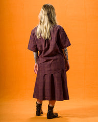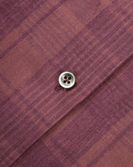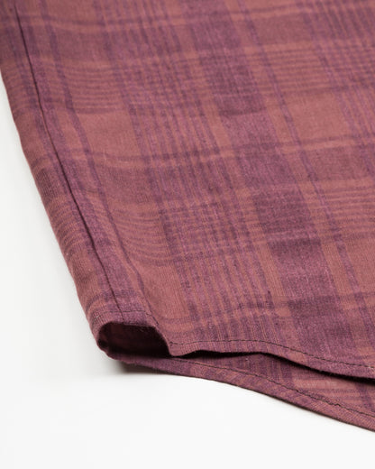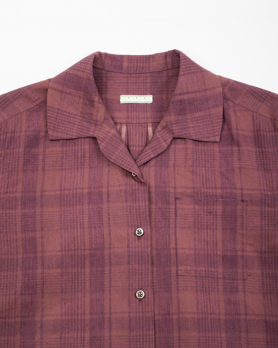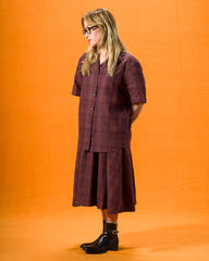 It's made from a lightweight linen/cotton blend check fabric that's breezy and comfortable from the moment you put it on, combining the drape and airiness of linen with the structure and softness of cotton. The "brown" colorway combines earthy reds, oranges, and shades of aubergine into a handsome low-contrast check pattern that's surprisingly easy to style.