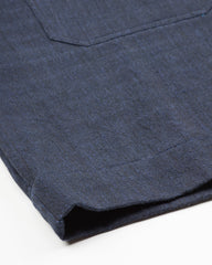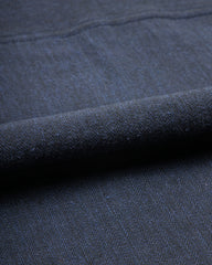 It's made from Indi + Ash's powerloom (so not handwoven) cotton herringbone, with a dark navy finish thanks to its iron-dyed warp and natural indigo dyed weft yarns. Over time, both dyes will fade from wear and washing, resulting in a unique and handsome patina across the fabric's surface. It's surprisingly soft from day one, despite its respectable medium weight, and drapes excellently for a summer fabric.