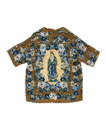 It's made from a blend of 96% cupro and 4% silk, with a lightweight and smooth hand as well as a comfortable, fluid drape. The body features a floral pattern throughout, with a full back design of the Virgin Mary.