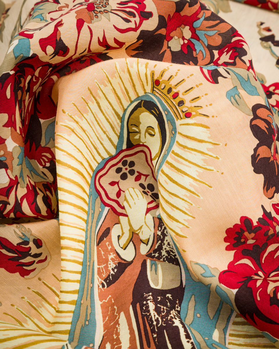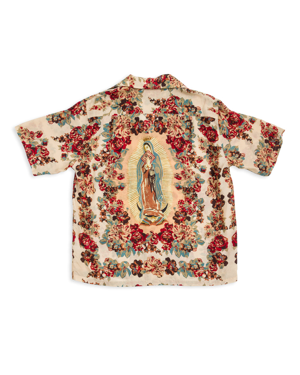 It's made from a blend of 96% cupro and 4% silk, with a lightweight and smooth hand as well as a comfortable, fluid drape. The body features a floral pattern throughout, with a full back design of the Virgin Mary.