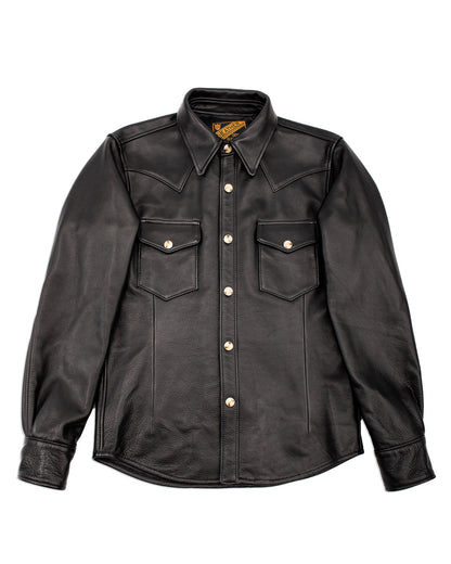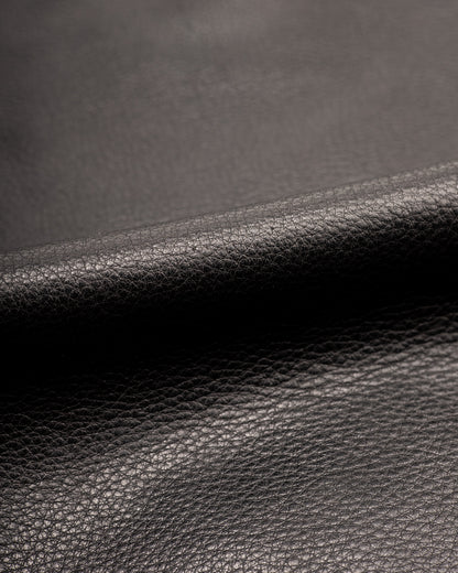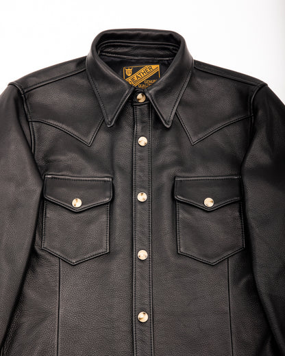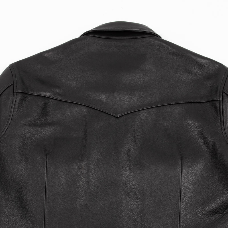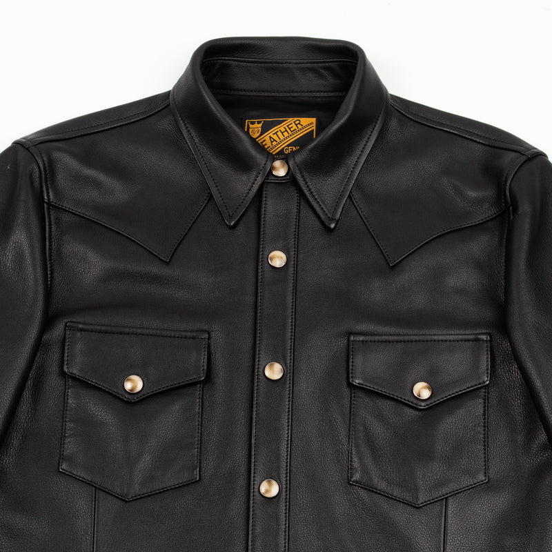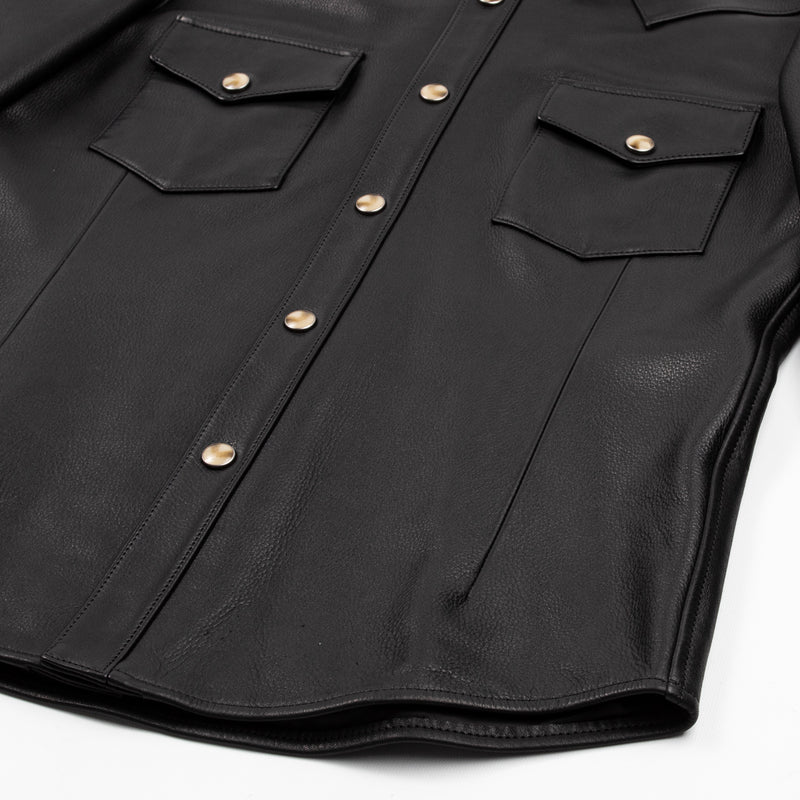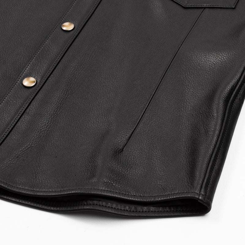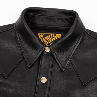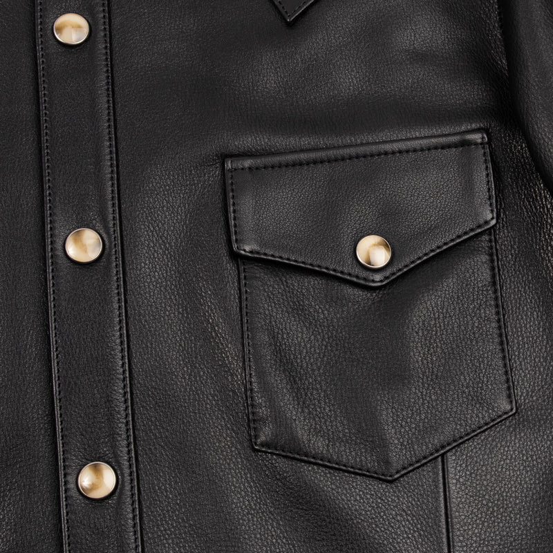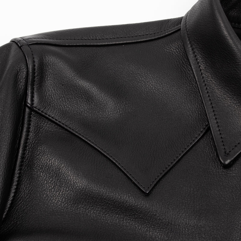 The shadowy counterpart to the Camel Western - this black leather is NOT tea-core, meaning that it will stay solidly black over time, and will NOT scuff or fade to brown. The subtle grain texture present across the hide is enhanced by the leather's slight shine, giving visual depth and detail to the shirt from any distance.