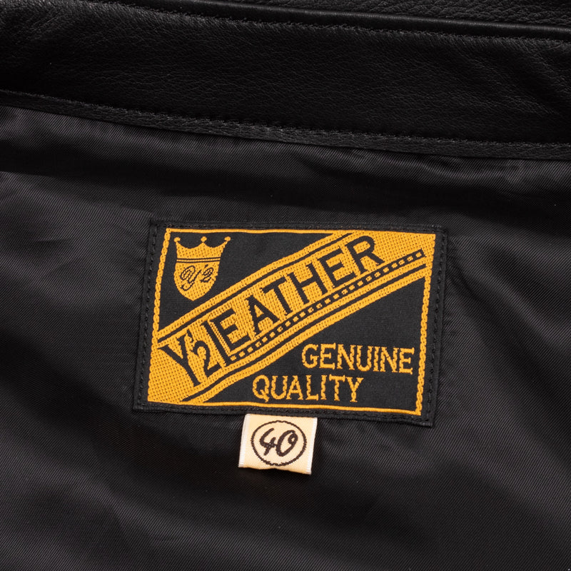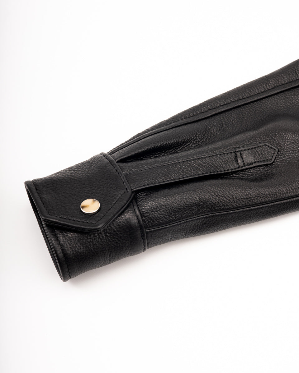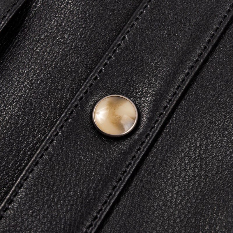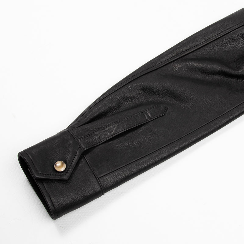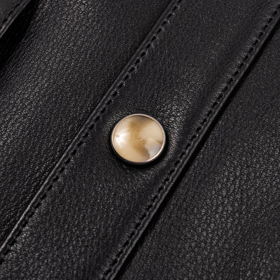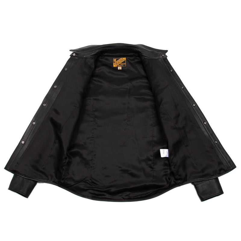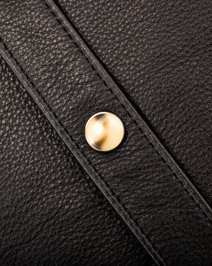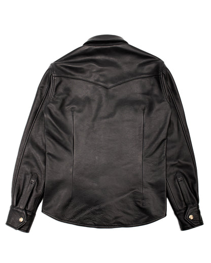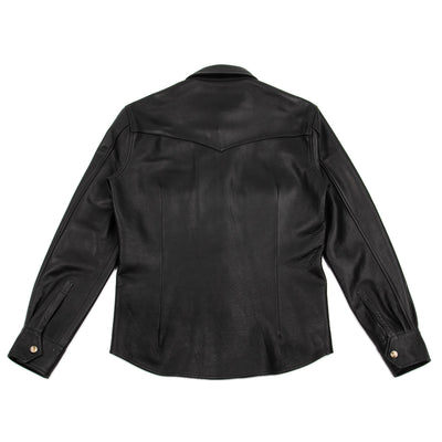 The shadowy counterpart to the Camel Western - this black leather is NOT tea-core, meaning that it will stay solidly black over time, and will NOT scuff or fade to brown. The subtle grain texture present across the hide is enhanced by the leather's slight shine, giving visual depth and detail to the shirt from any distance.