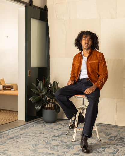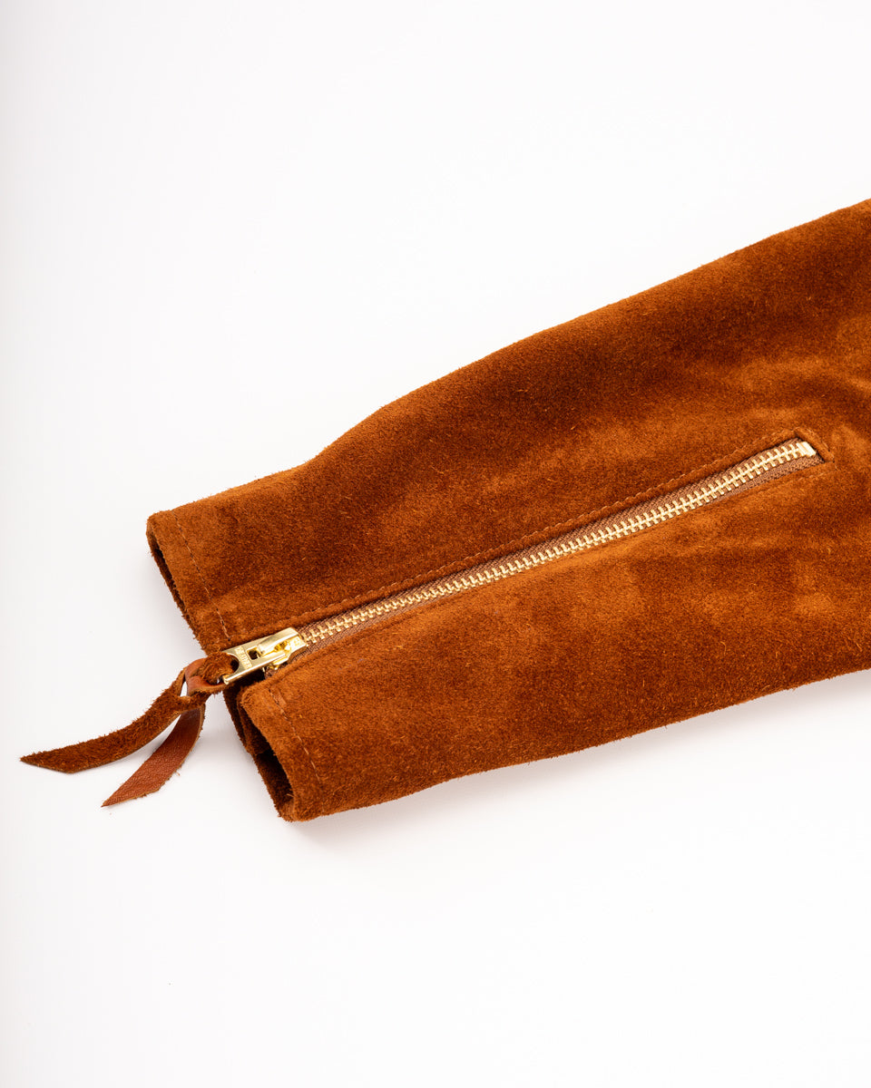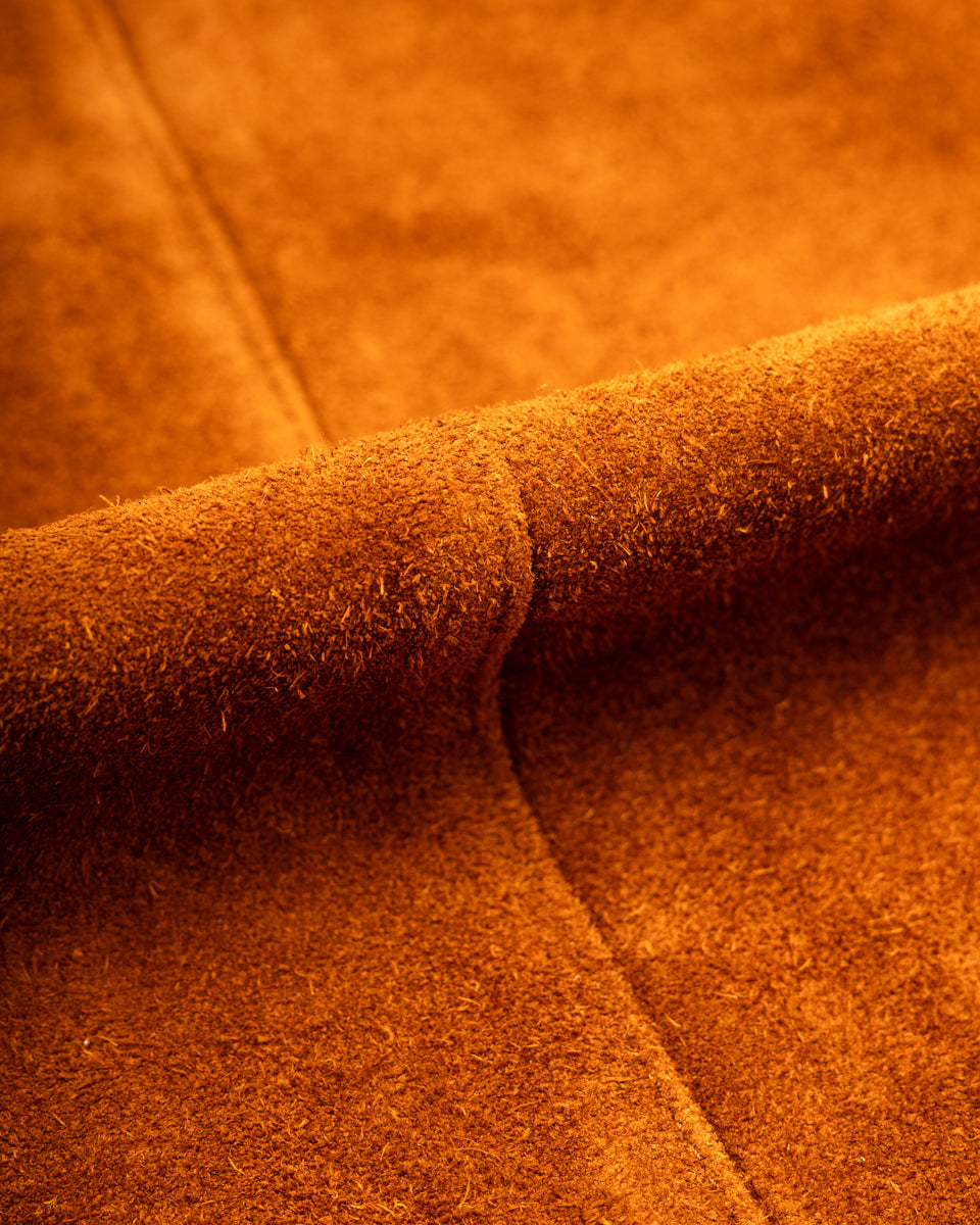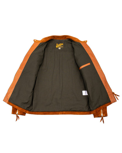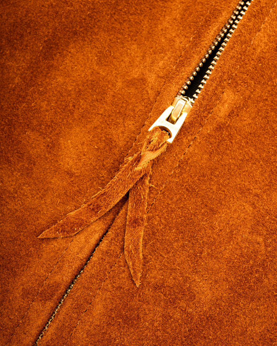 The all brass hardware compliments the warm-toned suede exterior, with Universal chain tab zips at the chest pockets and a brass snap closing up the collar. Inside, it's lined with a soft and breathable cotton/linen canvas for comfort and durability, with 100% cupra sleeve linings, allowing you to comfortably wear this jacket over tees and other light under-layers without issue.